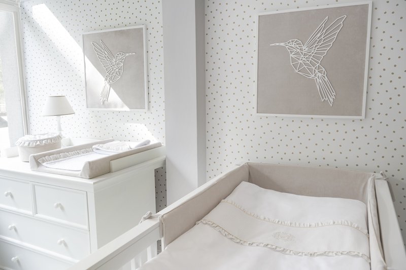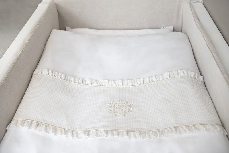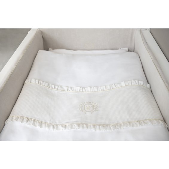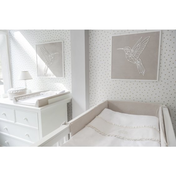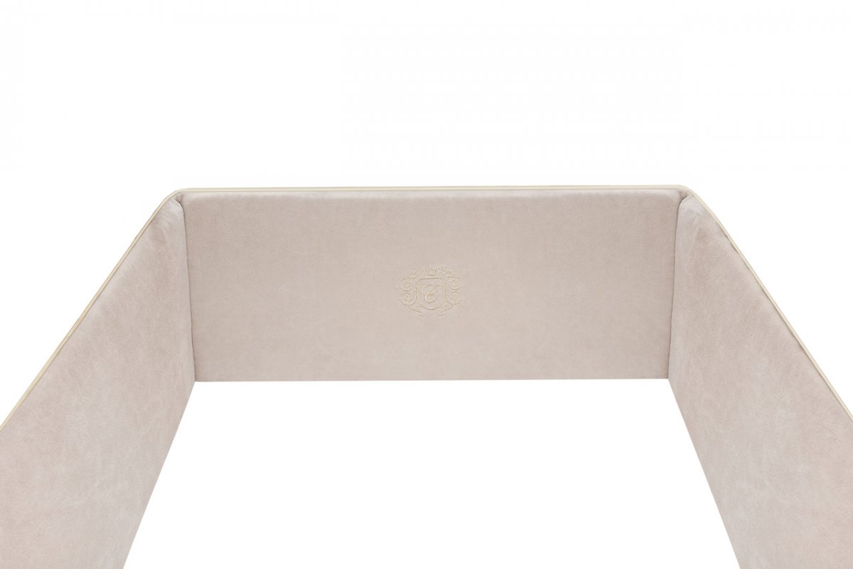 The Golden Sand cot bumper is made of high quality velvet fabric and decorated with an elegant golden emblem. Thanks to the filling made of a special sponge, the protector is stiff and adheres well to the cot. Short straps allow you to easily mount it to the rung. The cover is fastened with a zip, which allows you to easily remove it, as well as remove the internal sponge. Both products are washable.