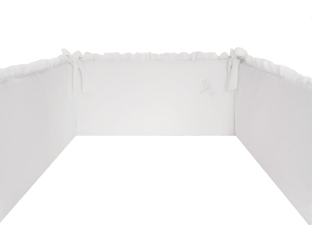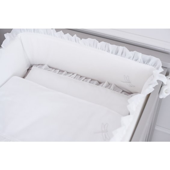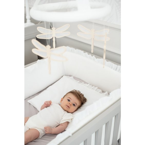 The Ivory Mist cot bumper is made of high quality ivory velour and decorated with a transparent voile frill and an embroidery. Thanks to the filling made of a special sponge, the protector is stiff and adheres well to the cot. The straps allow you to easily mount it to the rung. The cover is fastened with a zip, which allows you to easily remove it, as well as remove the internal sponge. Both products are washable.