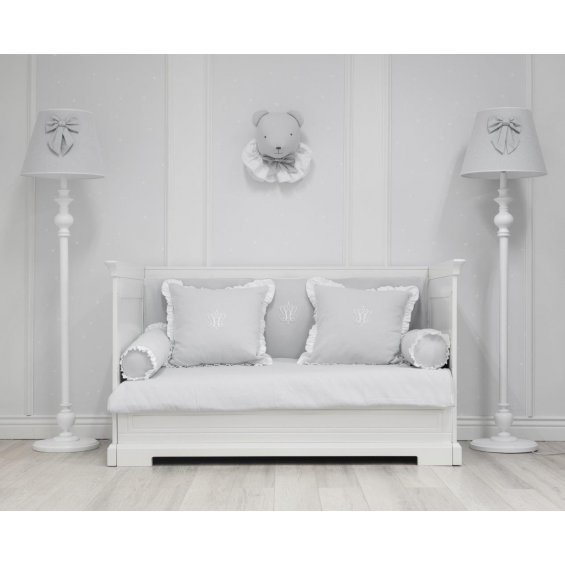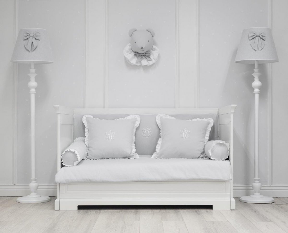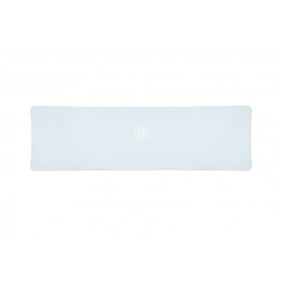 Protective panel on the long side of the cot, adjusted in height to the bottom level of the mattress. Thanks to the filling made of a special sponge, it is stiff and adheres well to the cot, and the straps allow it to be easily attached to the rungs. The quilted covering is removable for washing and zippered. The inner sponge is also washable in the washing machine. The panel is decorated with Caramella white emblem.