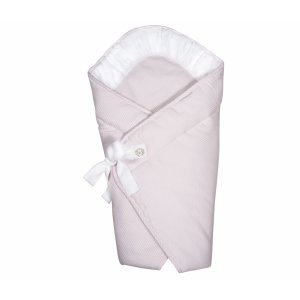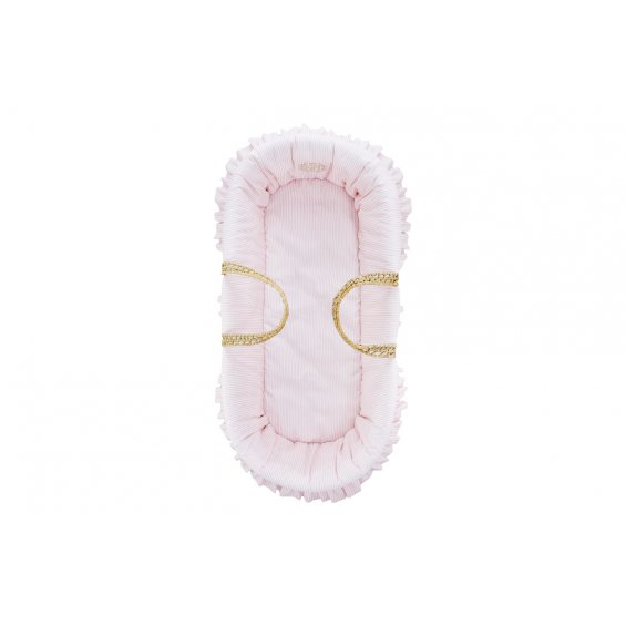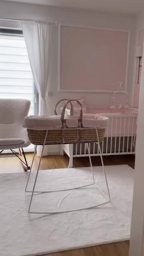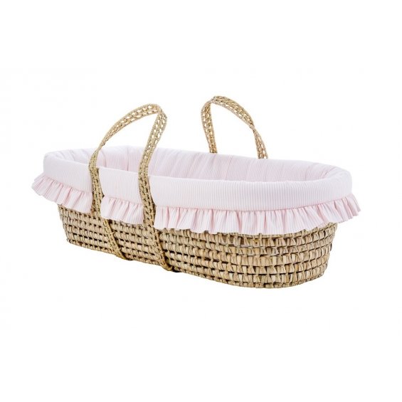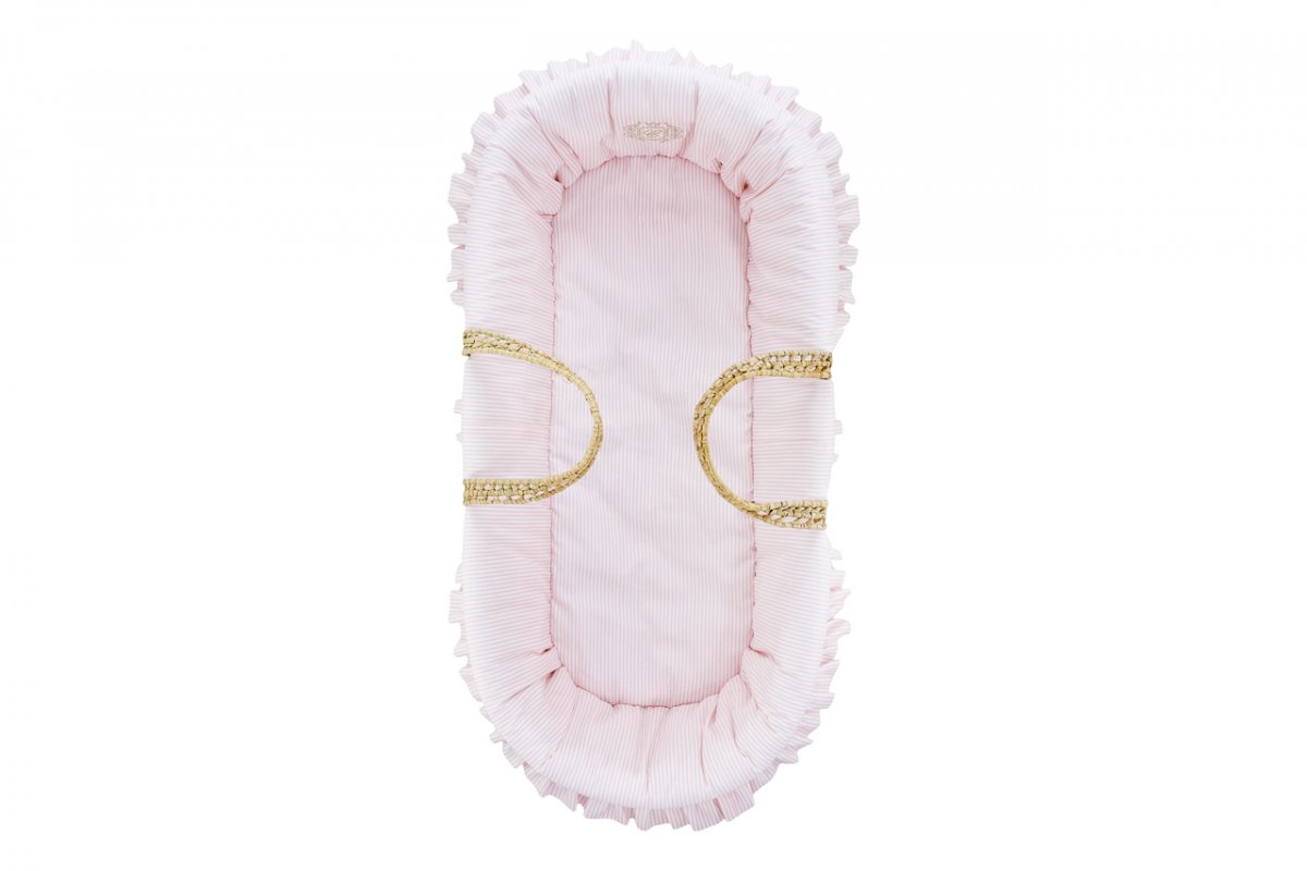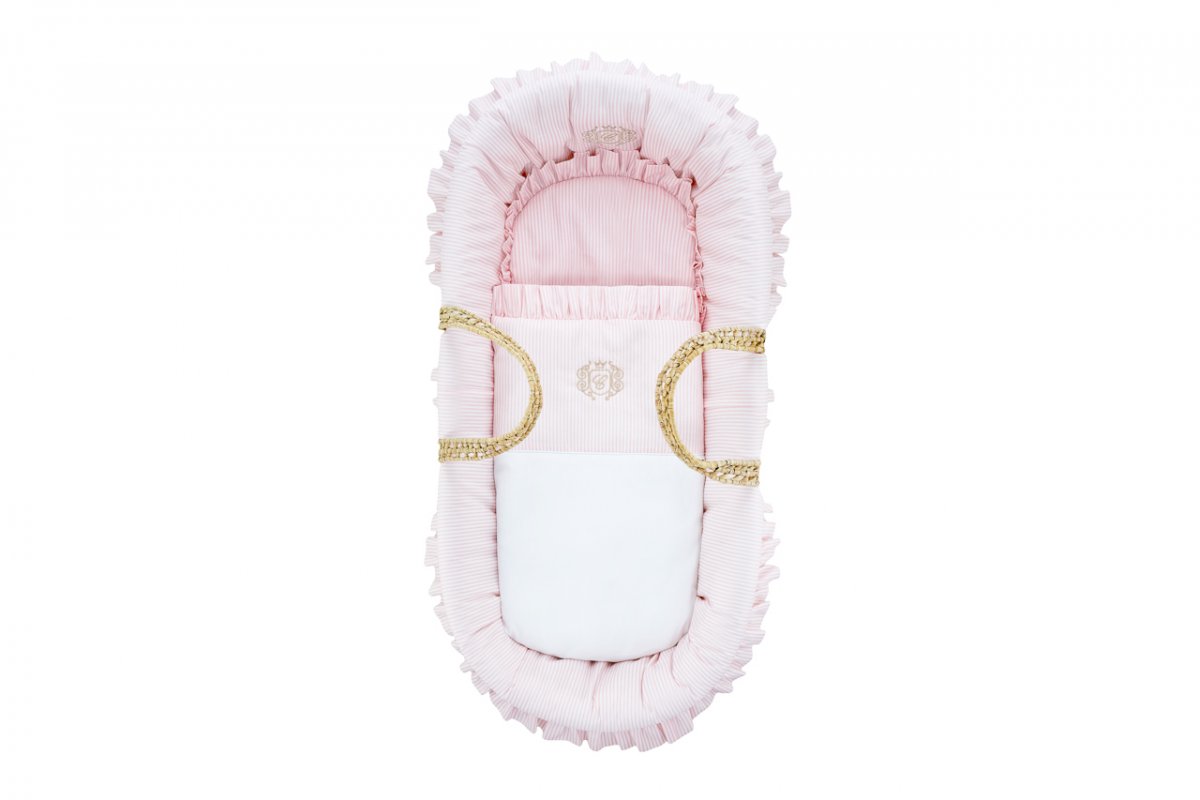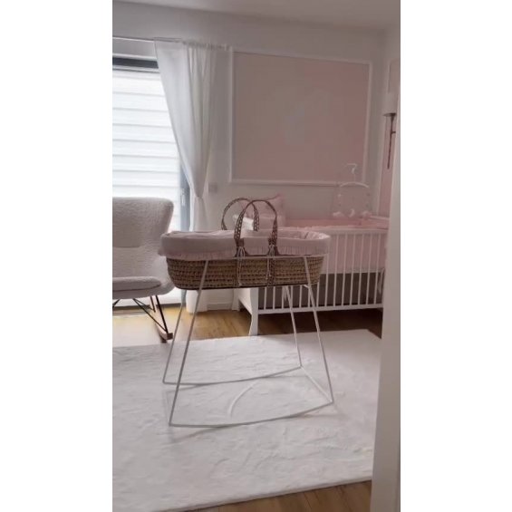 Adorable Moses' basket made of palm leaves safe for a child. It has a lining made of cotton textile with white and baby pink straps and an oval sponge mattress. The lining is tied to the basket with little straps. It's decorated with an elegant gold company emblem and a charming flounce. The basket provides the child with a cozy place to sleep and a sense of comfort. Thanks to the fact that it is light, the young mother can easily move with it. The basket is also perfect for trips. It can be placed directly on the bed, on the couch or on the floor.