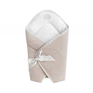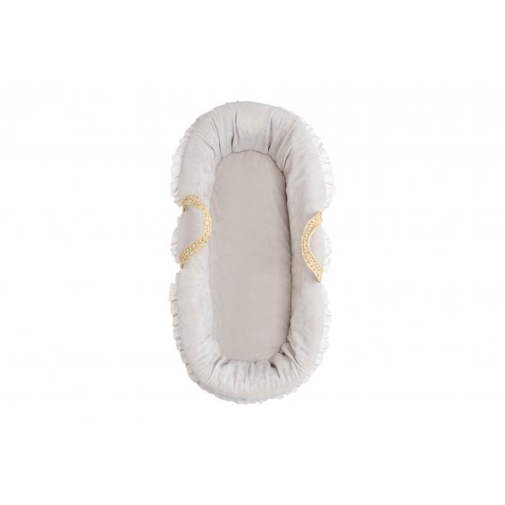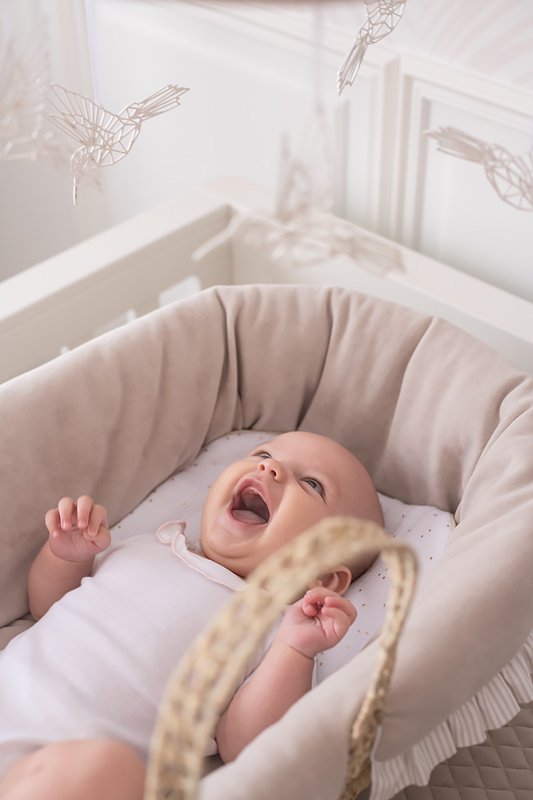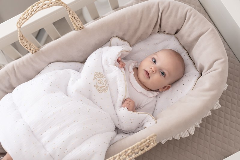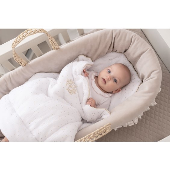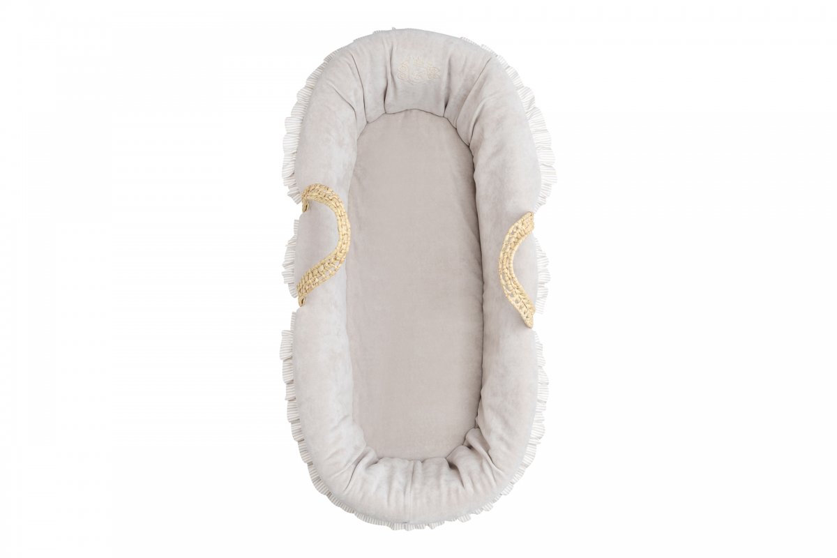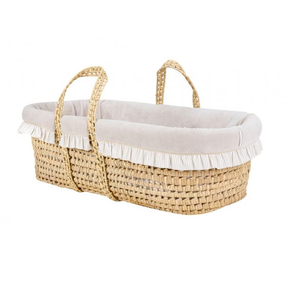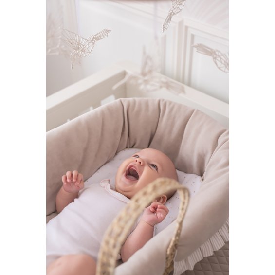 Adorable Moses' basket made of palm leaves safe for a child. It has a lining made of beige velour and an oval sponge mattress. The lining is tied to the basket with little straps. It's decorated with an elegant gold company emblem and a charming flounce. The basket provides the child with a cozy place to sleep and a sense of comfort. Thanks to the fact that it is light, the young mother can easily move with it. The basket is also perfect for trips. It can be placed directly on the bed, on the couch or on the floor.