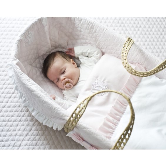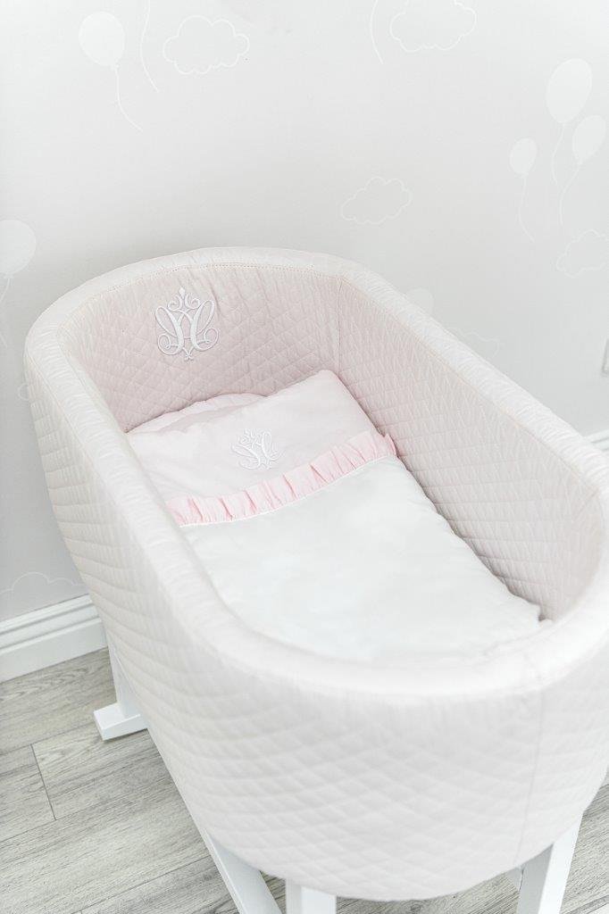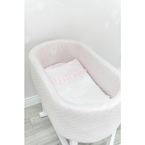 Mini bedding for the Moses' basket. Also ideal for a gondola, cradle and wicker bassinet. Made of white satin cotton. Decorated with a white three-dimensional company emblem and finished with a lovely flounce. The bedding has a filling.