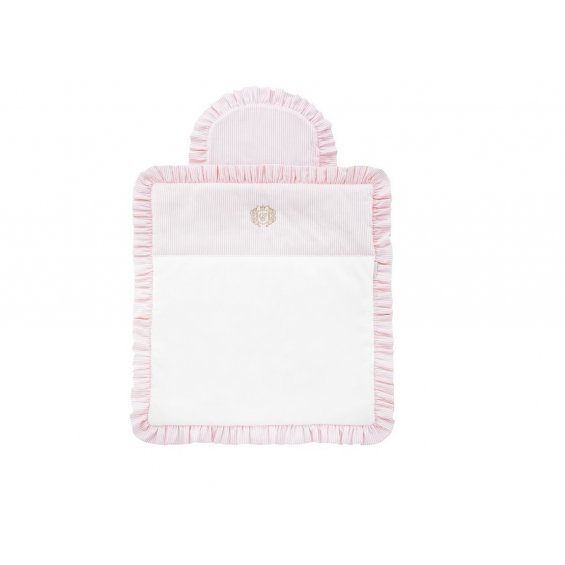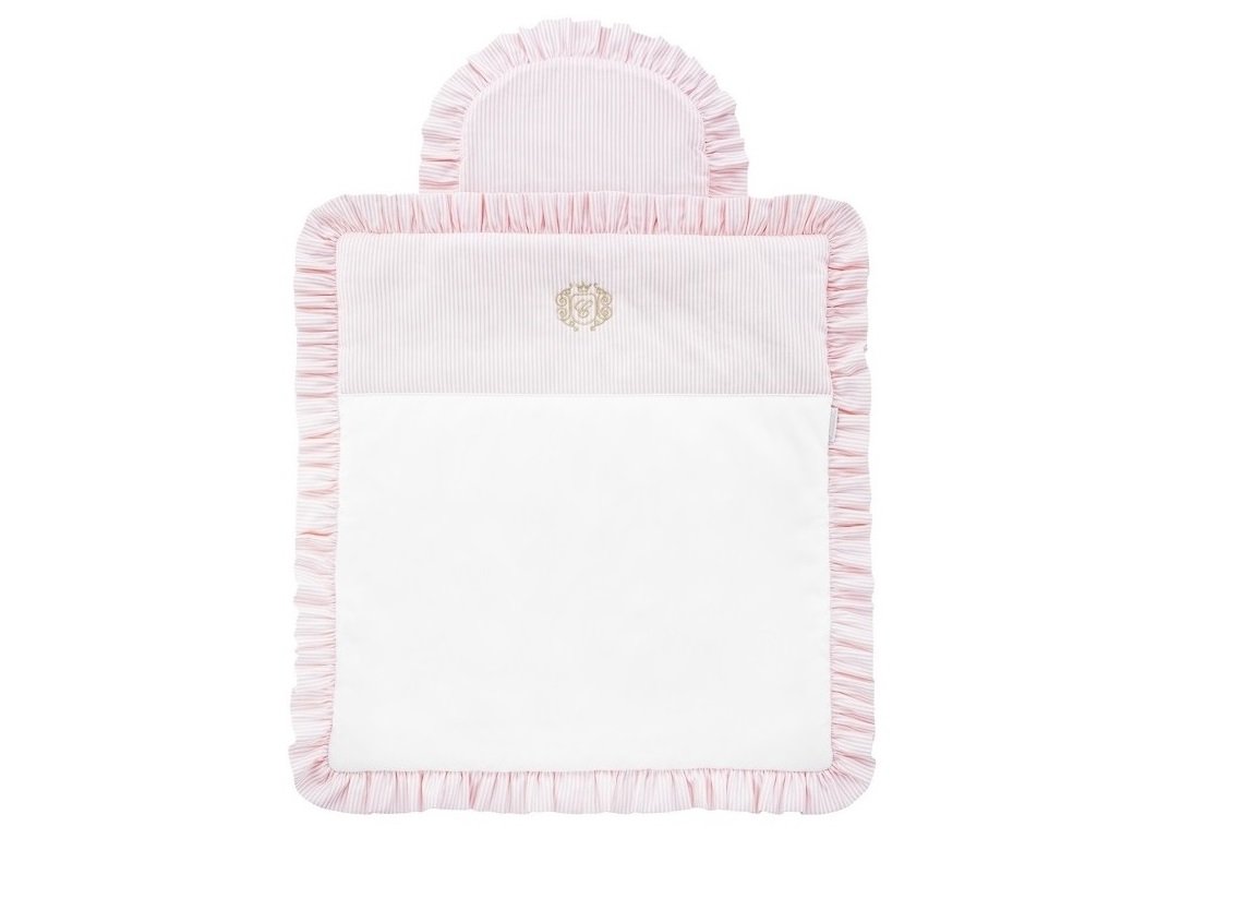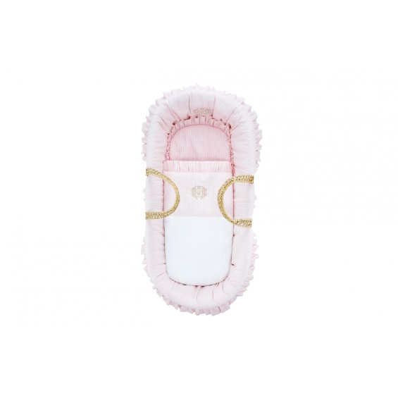 Mini bedding for the Moses' basket. Also ideal for a gondola, cradle and wicker bassinet. Made of white satin cotton and with a panel and a cushion in white-baby pink stripes. Decorated with a gold company emblem and finished with a lovely flounce. The bedding has a filling.