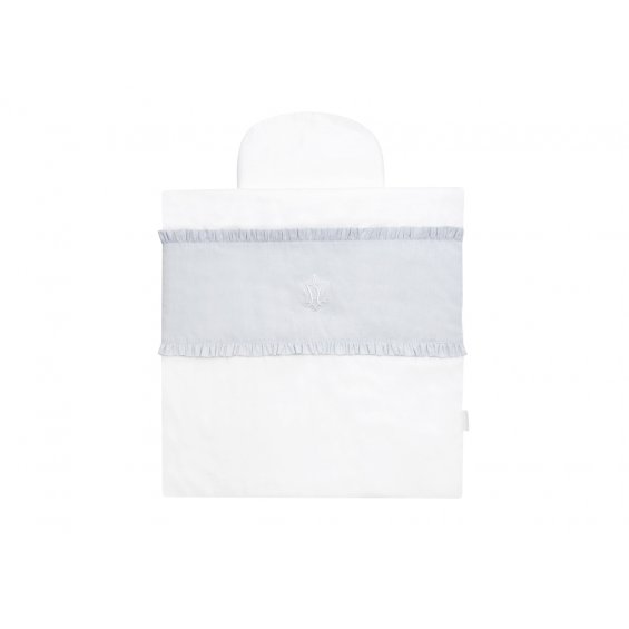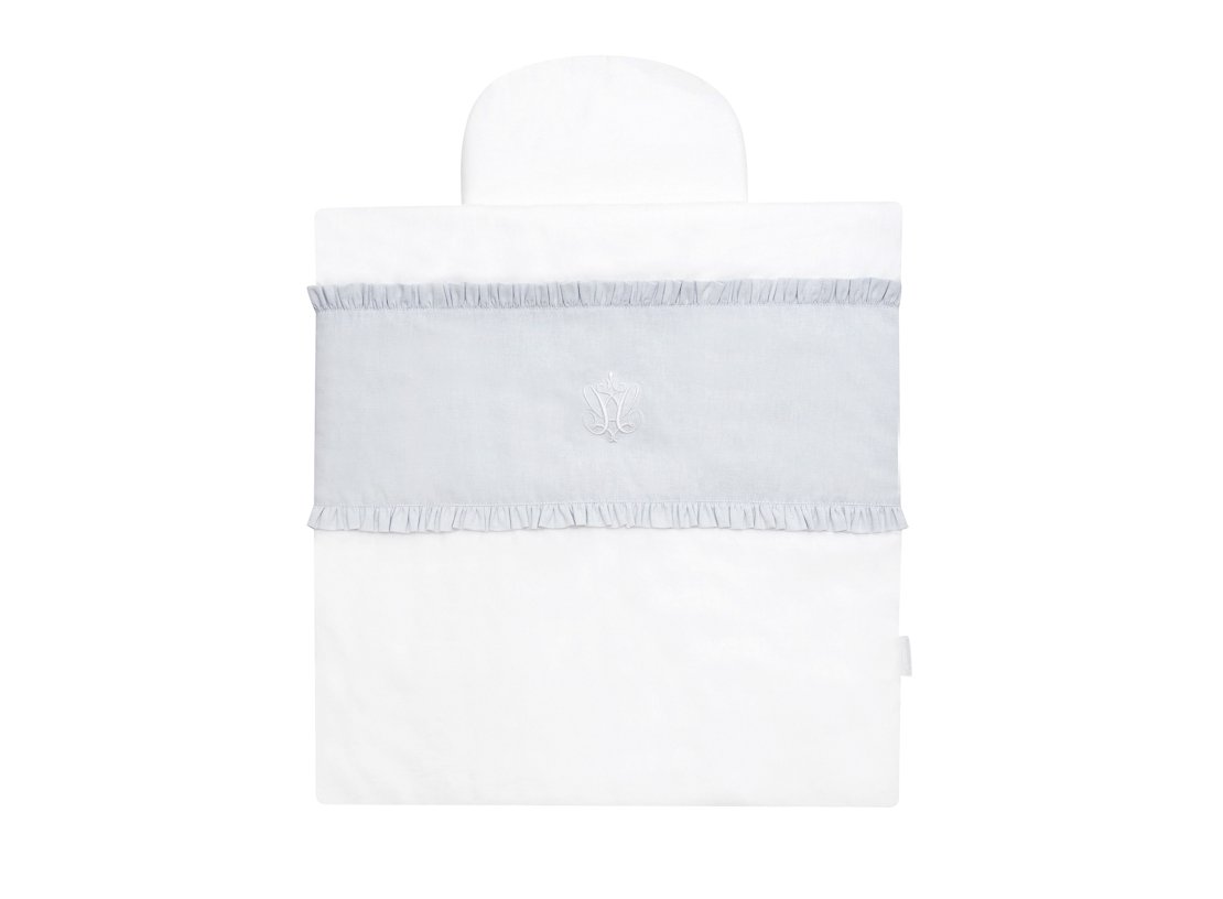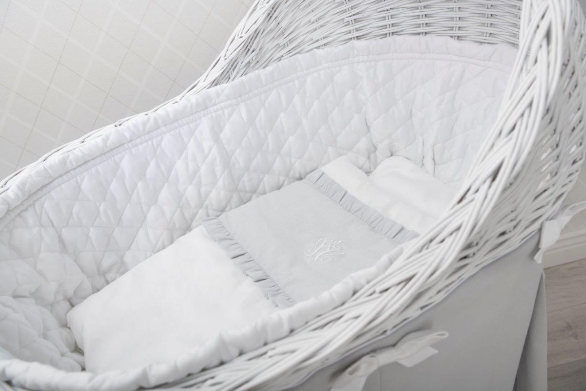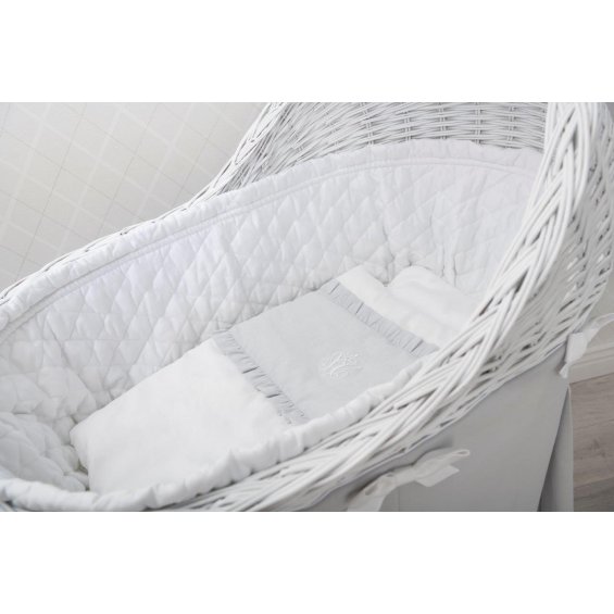 Mini bedding for the Moses' basket. Also ideal for a gondola, cradle and wicker bassinet. Made of white and light grey satin cotton. Decorated with a white three-dimensional company emblem and finished with a lovely flounce. The bedding has a filling.