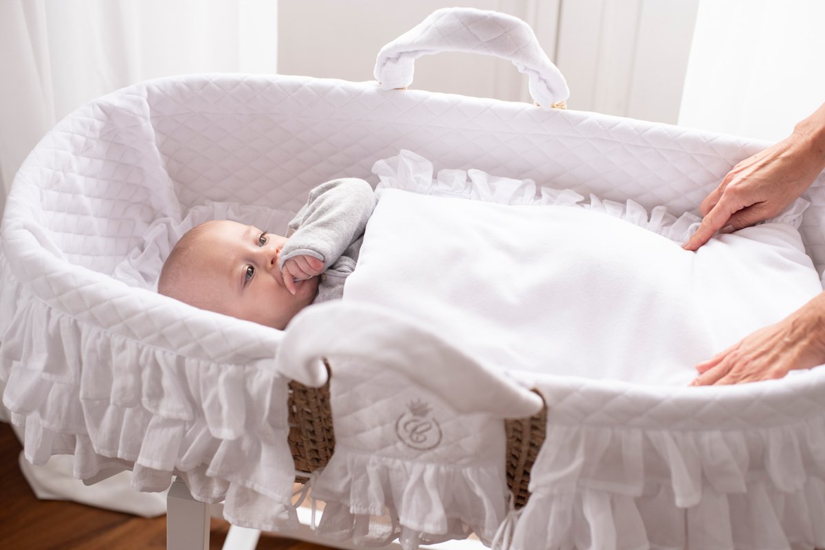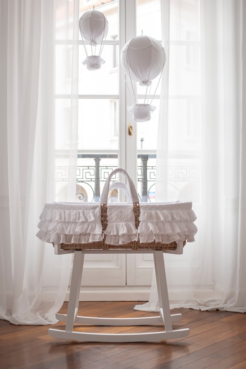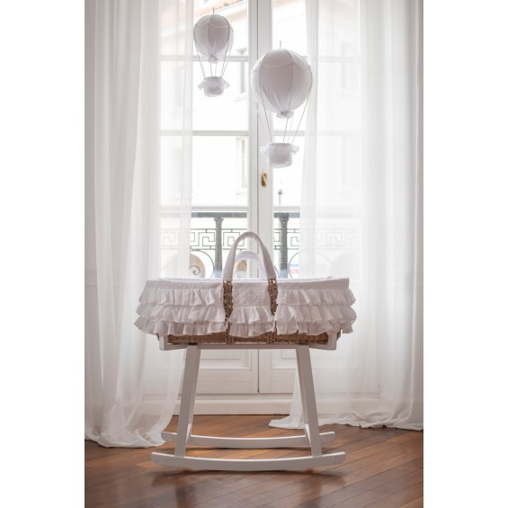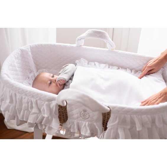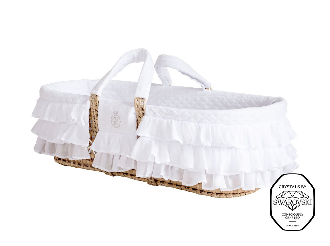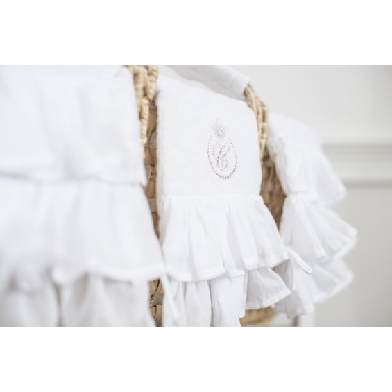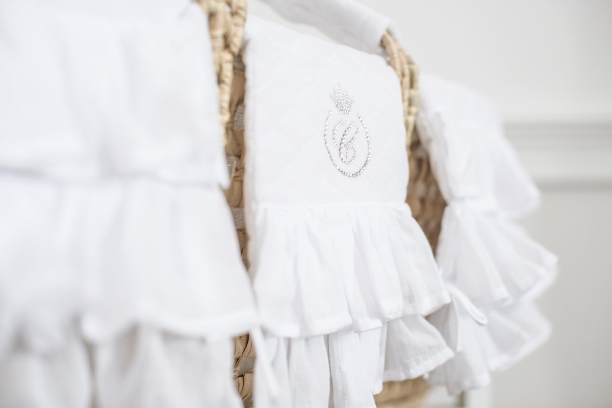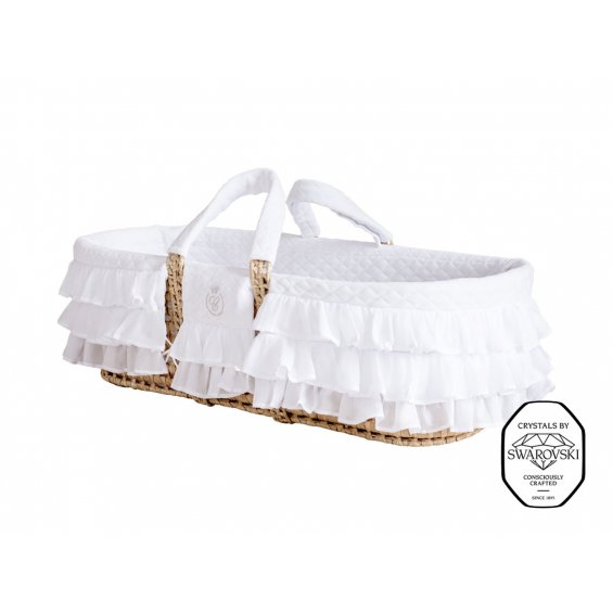 Luxury moses' basket embellished with crystals by Swarovski®. It is made of palm leaves safe for a child. It has a quilted velour lining in white colour, tied to the basket with small straps. The lining is embellished with crystals by Swarovski® and decorated with light transparent frill. At the bottom of the basket there is an oval sponge mattress. The basket of Moses provides the child with a cozy place to sleep and a sense of comfort. Thanks to the fact that it is light, the young mother can easily move with it. The basket is also perfect for trips. It can be placed directly on the bed, on the couch or on the floor.