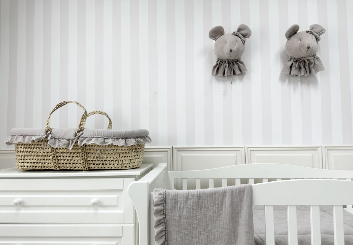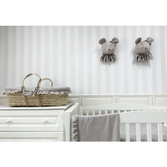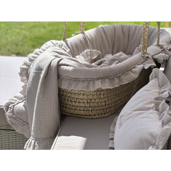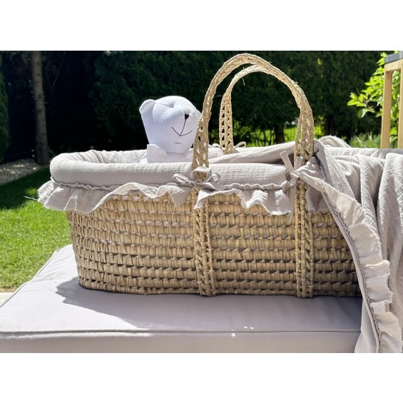 Adorable Moses' basket made of palm leaves safe for a child. It has a lining made of beige muslin and an oval sponge mattress. The lining is tied to the basket with little straps. It's decorated with an elegant embroidery and a charming flounce. The basket provides the child with a cozy place to sleep and a sense of comfort. Thanks to the fact that it is light, the young mother can easily move with it. The basket is also perfect for trips. It can be placed directly on the bed, on the couch or on the floor.