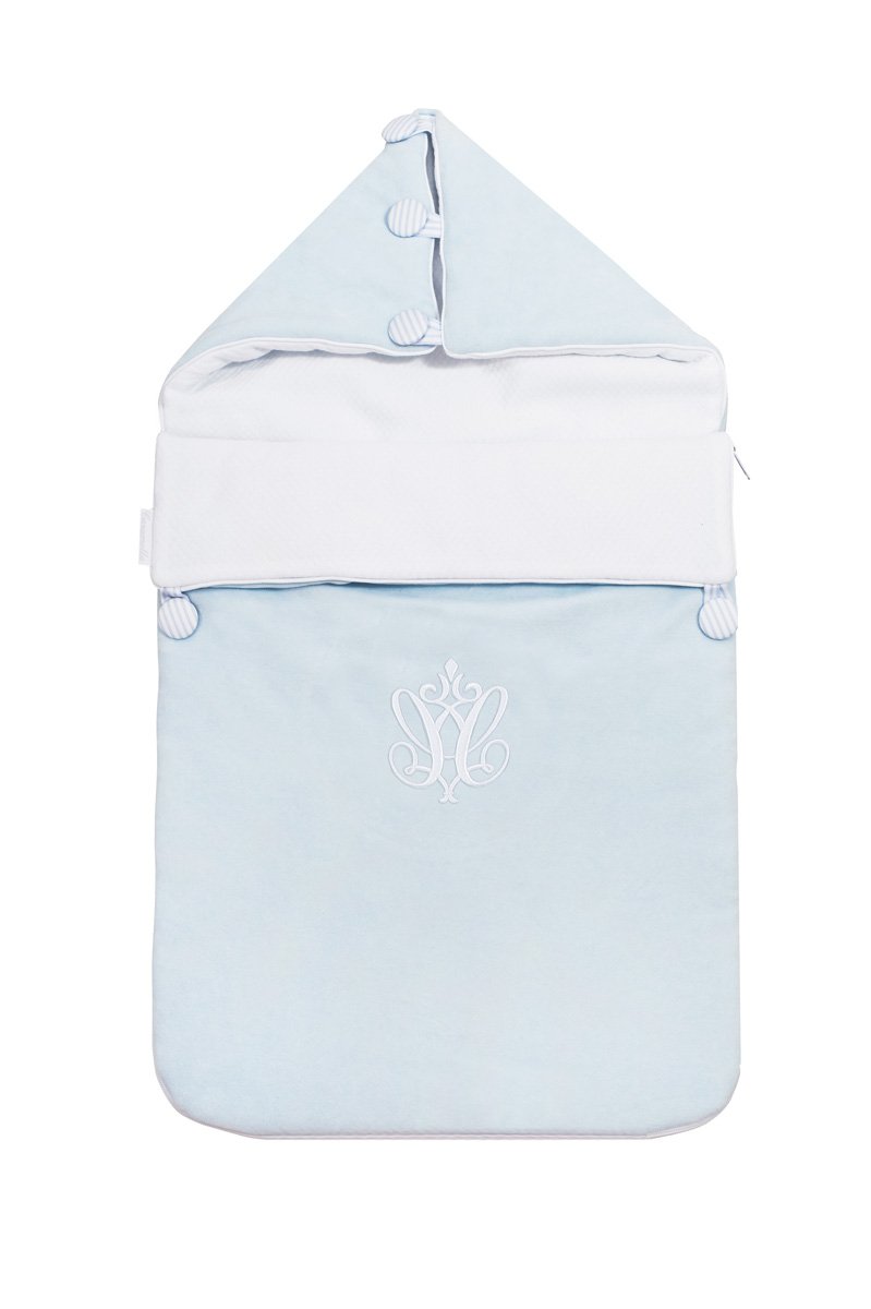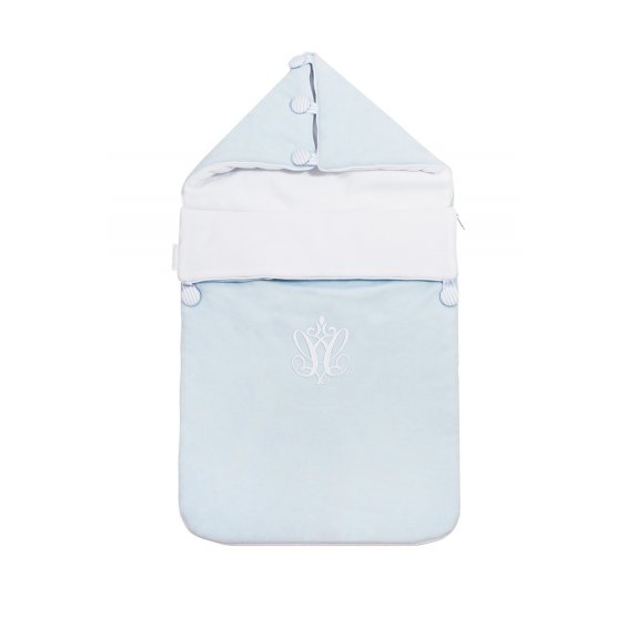 Adorable sleeping bag for little boys made of soft blue velvet. Its inner part is made of white waffle textile in white. This sleeping bag is equipped with a hood with buttons but after unfolding it, it may be a blanket or a mat. There are also special holes in the back of the sleeping bag that allow you to useit in a car seat.