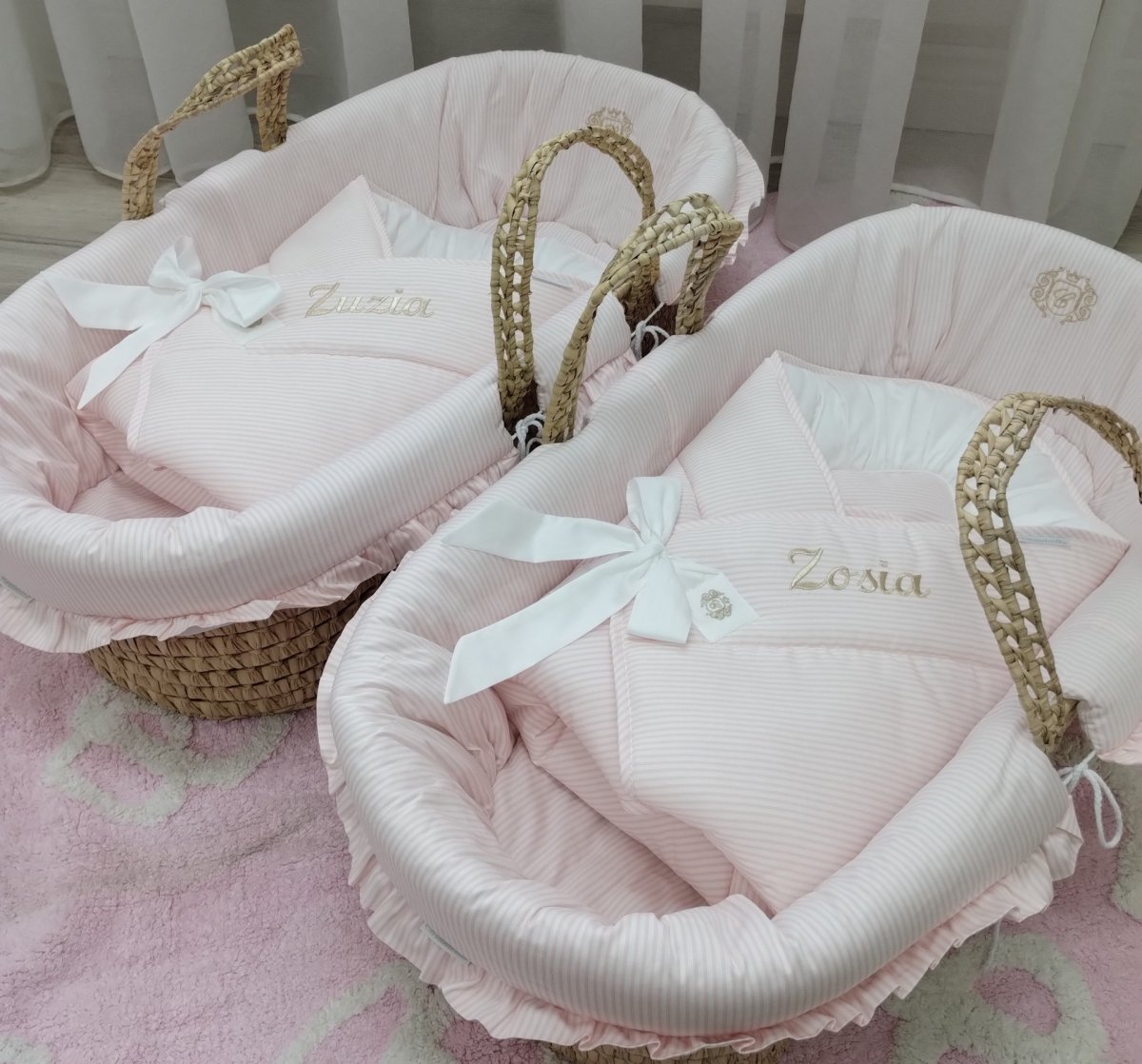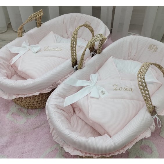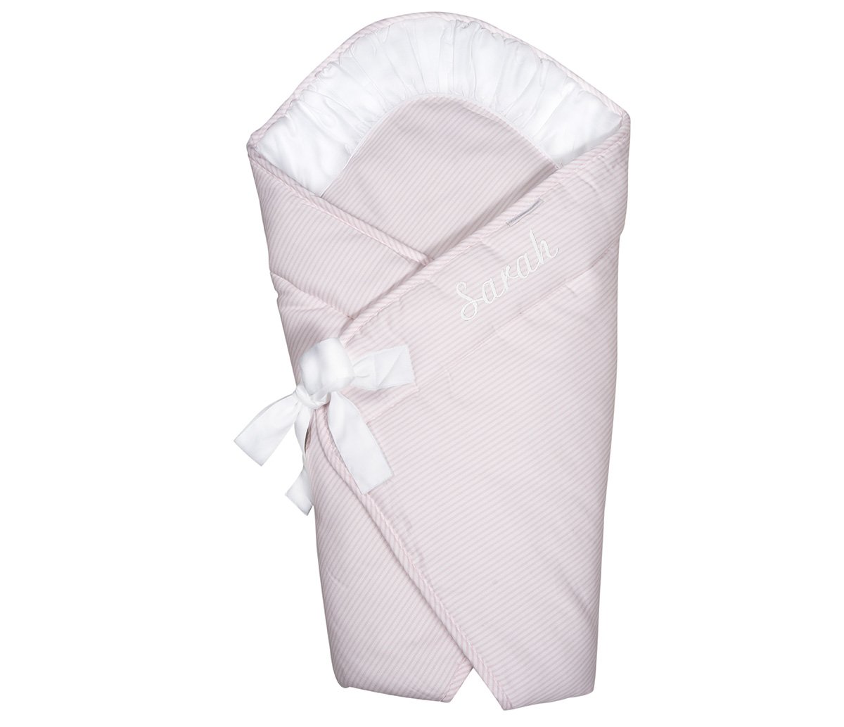 An elegant white and pink baby's sleeping bag decorated with elegant embroidery with your child's name. It is made of striped textile with white folds and finished with a white bow. The inner part is filled with non-woven fabric what makes it very warm and cozy. It has not any stiffening elements and can be used as a summer quilt. There is a possibility of baby's sleeping bag with an embroidery production.