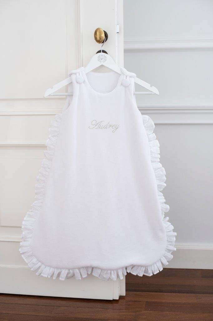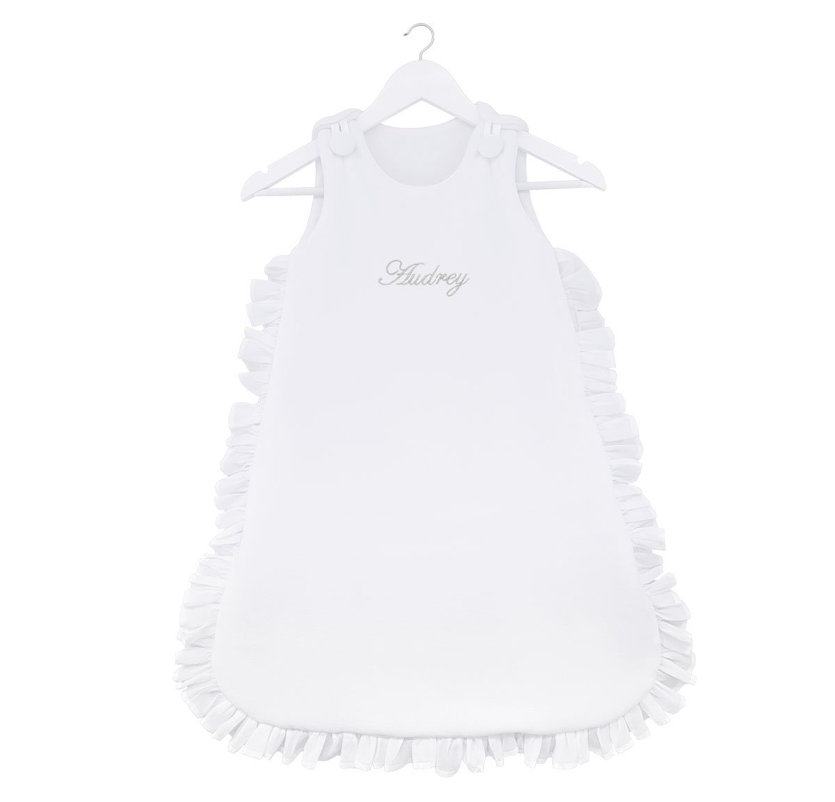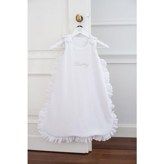 Luxurious sleeping bag made of baby's skin-pleasing velour in white. It is decorated with a transparent frill and silver embroidery with your baby's name. Very comfortable to use - there is a long zipper on the side. Ideal for babies wriggling and exploring while sleeping.