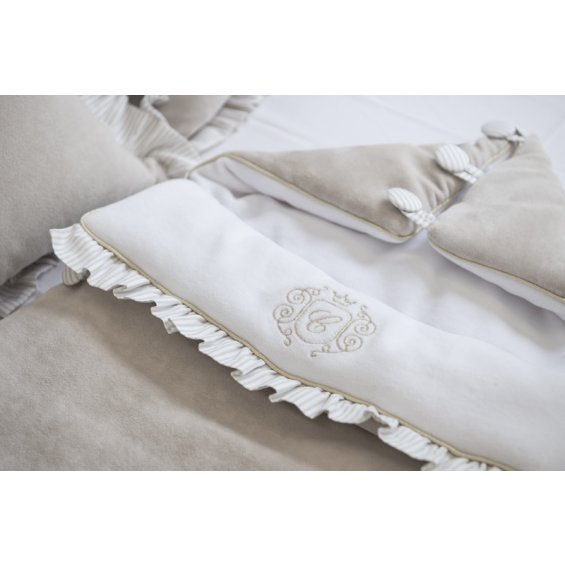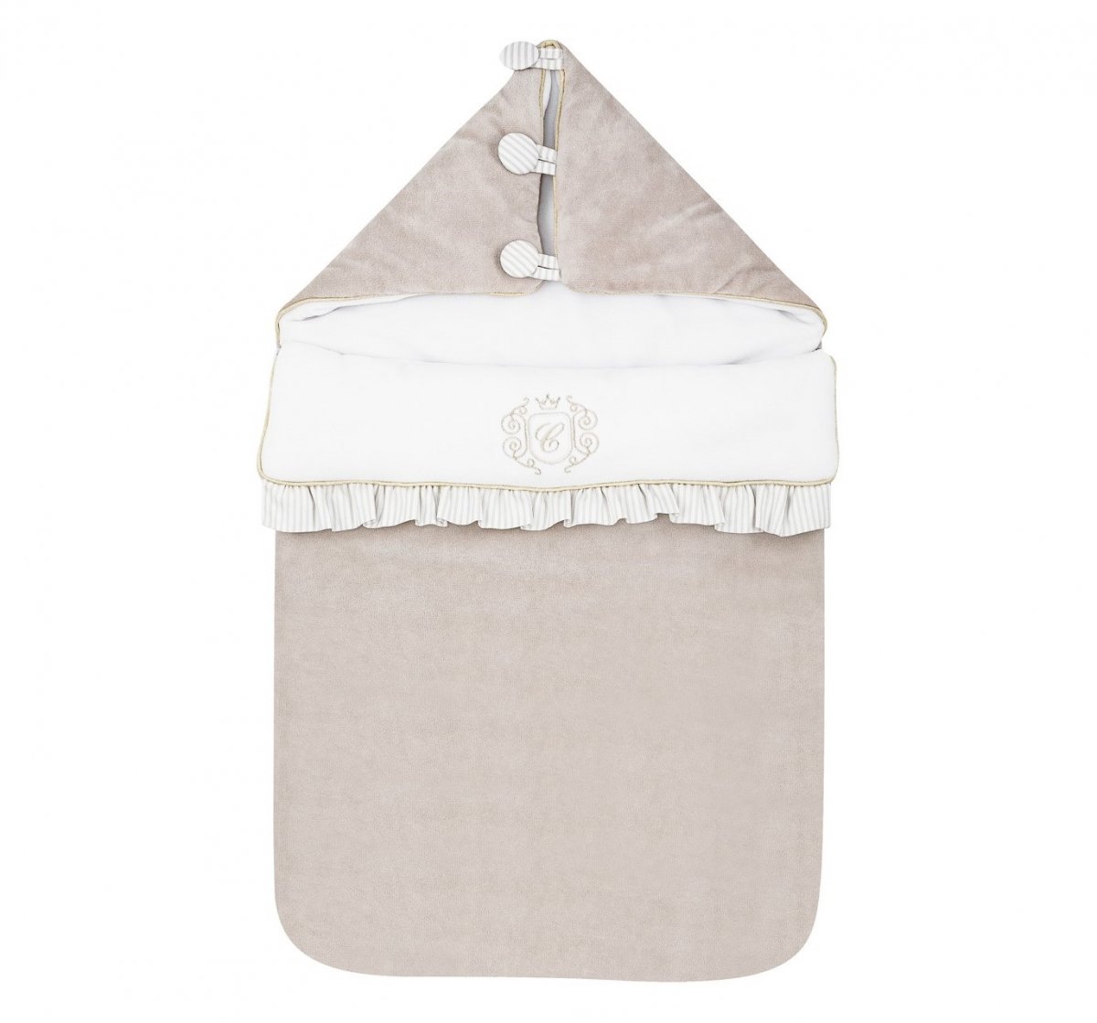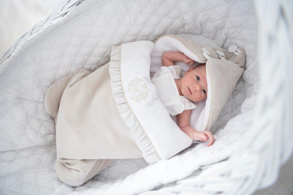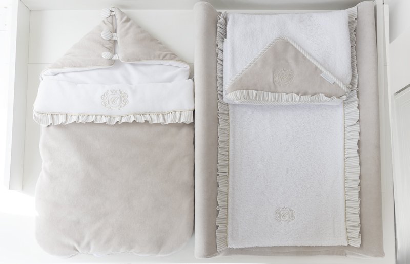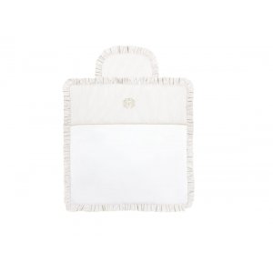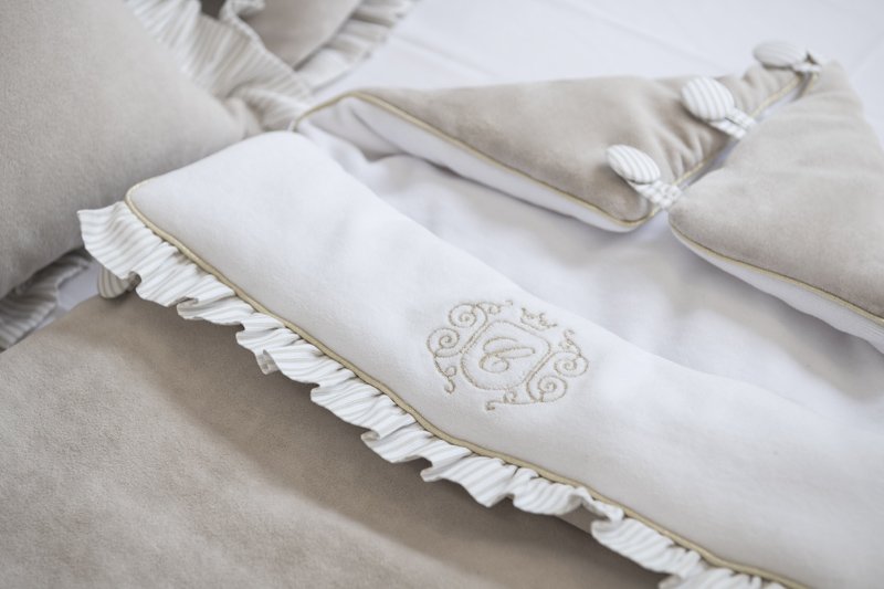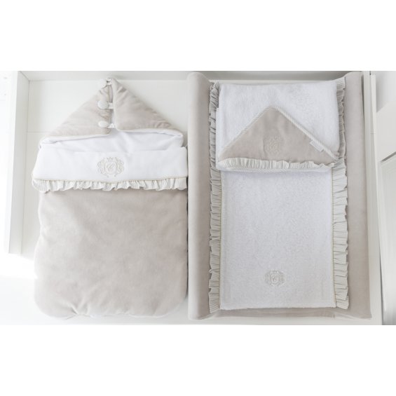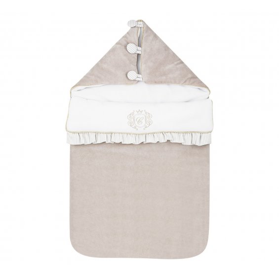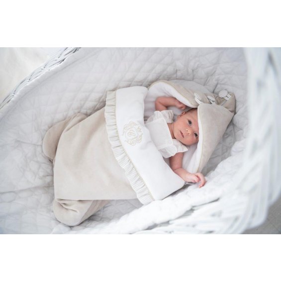 Adorable sleeping bag made of soft beige velvet. Its inner part is made of velour in white. Decorated with an elegant gold emblem. This sleeping bag is equipped with a hood with buttons but after unfolding it, it may be a blanket or a mat. There are also special holes in the back of the sleeping bag that allow you to useit in a car seat.