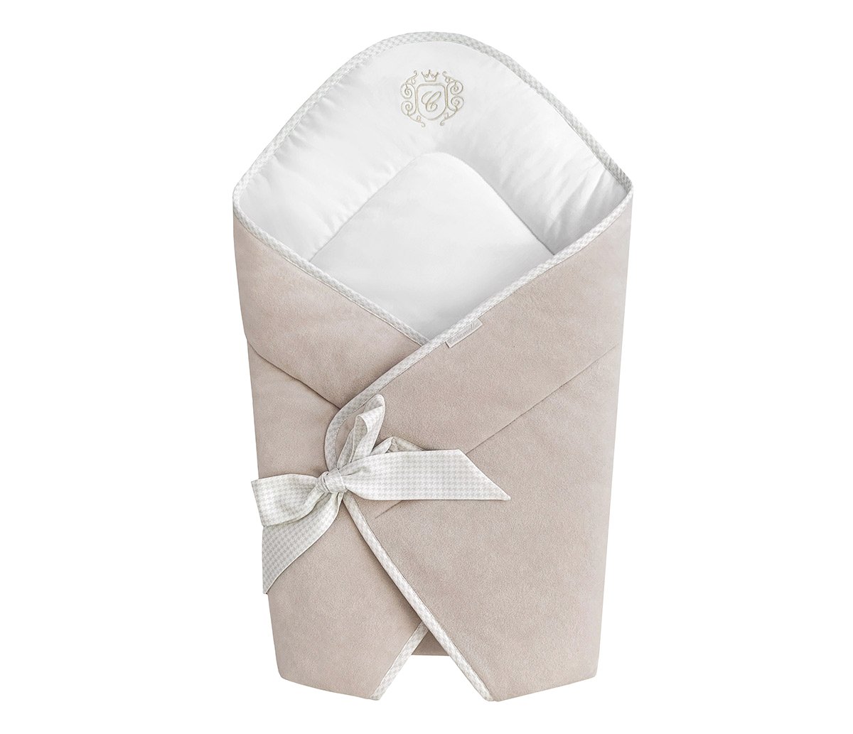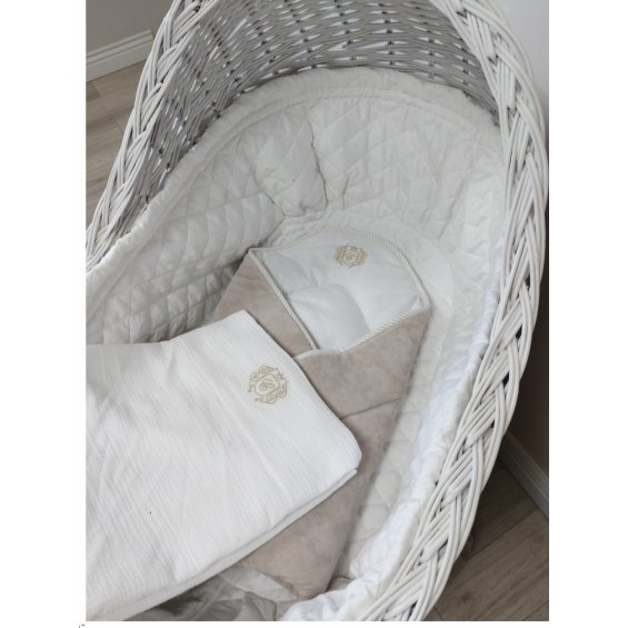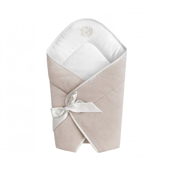 Elegant sleeping bag in beige. It is made of beige velor and filled with a fleece, making it very nice and warm. Decorated with gold company embroidery. It is very comfortable to use - tied to a bow. It has no stiffening, and when unfolded it will also be perfect as a summer quilt.