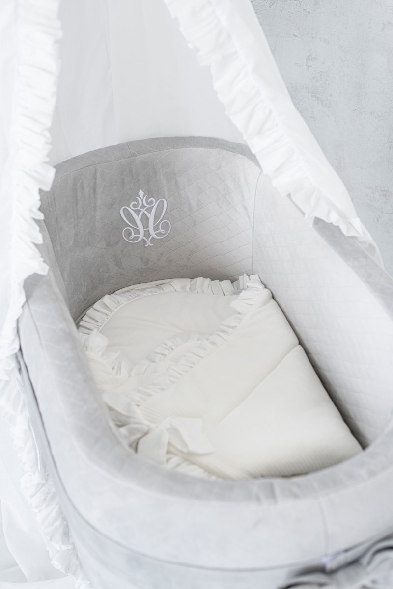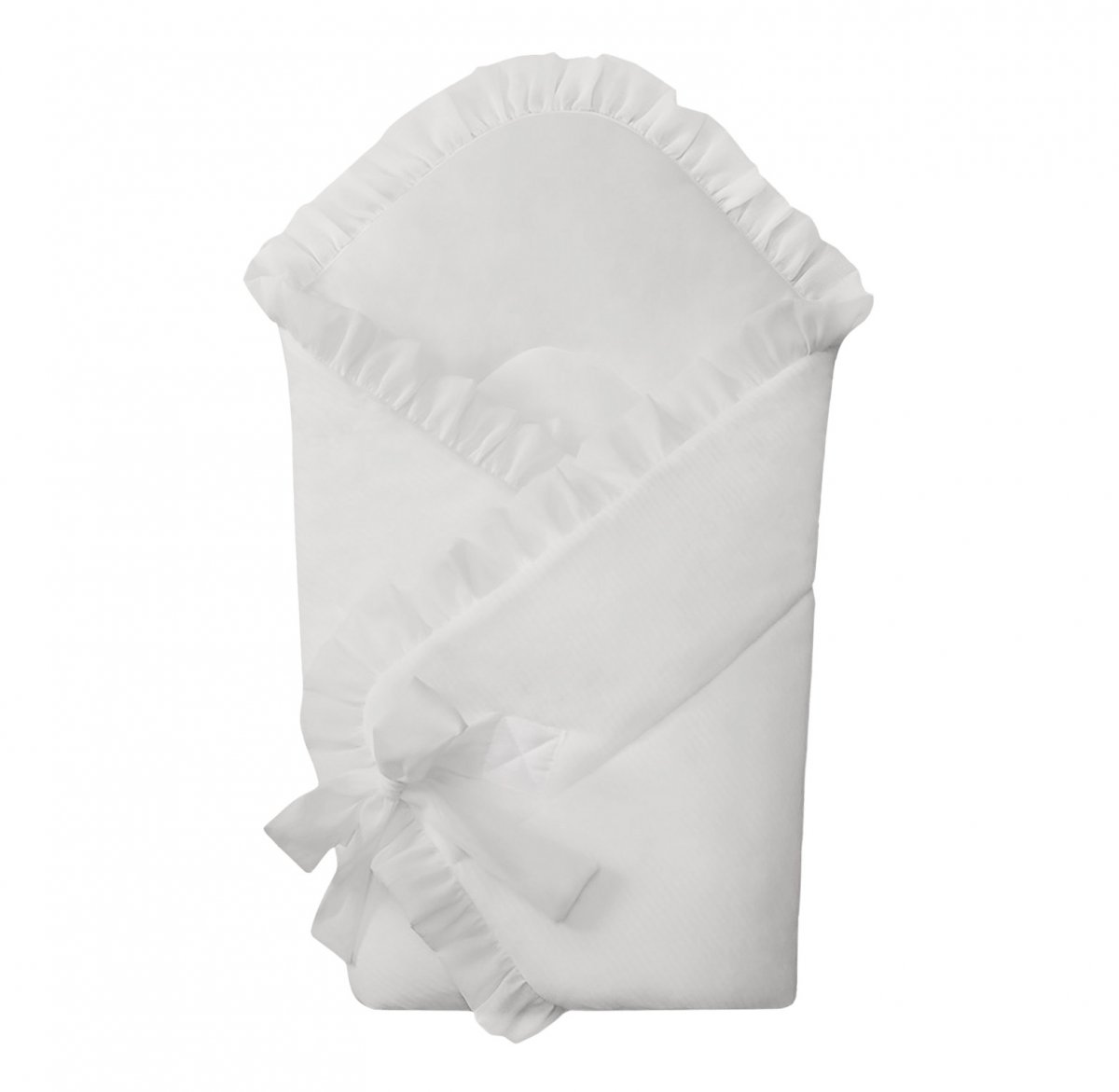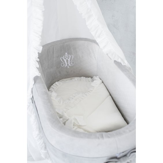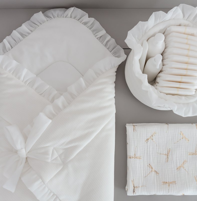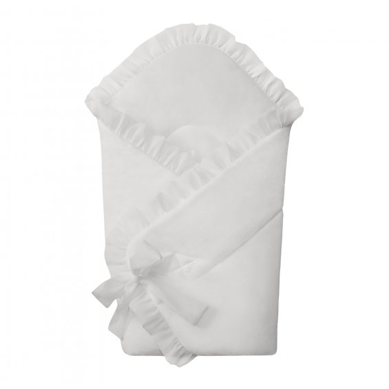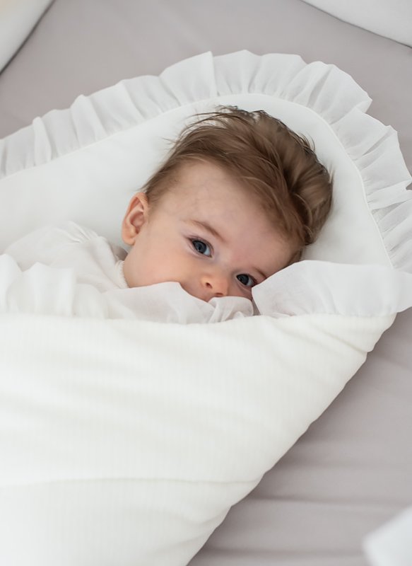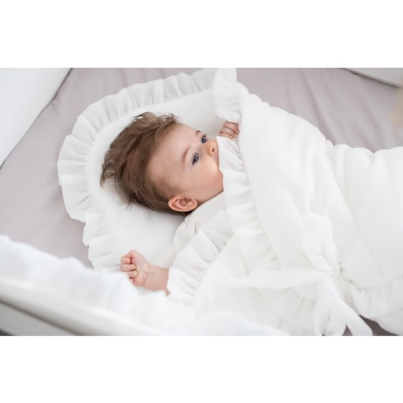 Elegant sleeping bag for newborns. It is made of ivory velour and filled with a fleece, making it very nice and warm. Decorated with transparent voile frill. It is very comfortable to use - tied to a bow. It has no stiffening, and when unfolded it will also be perfect as a summer quilt.