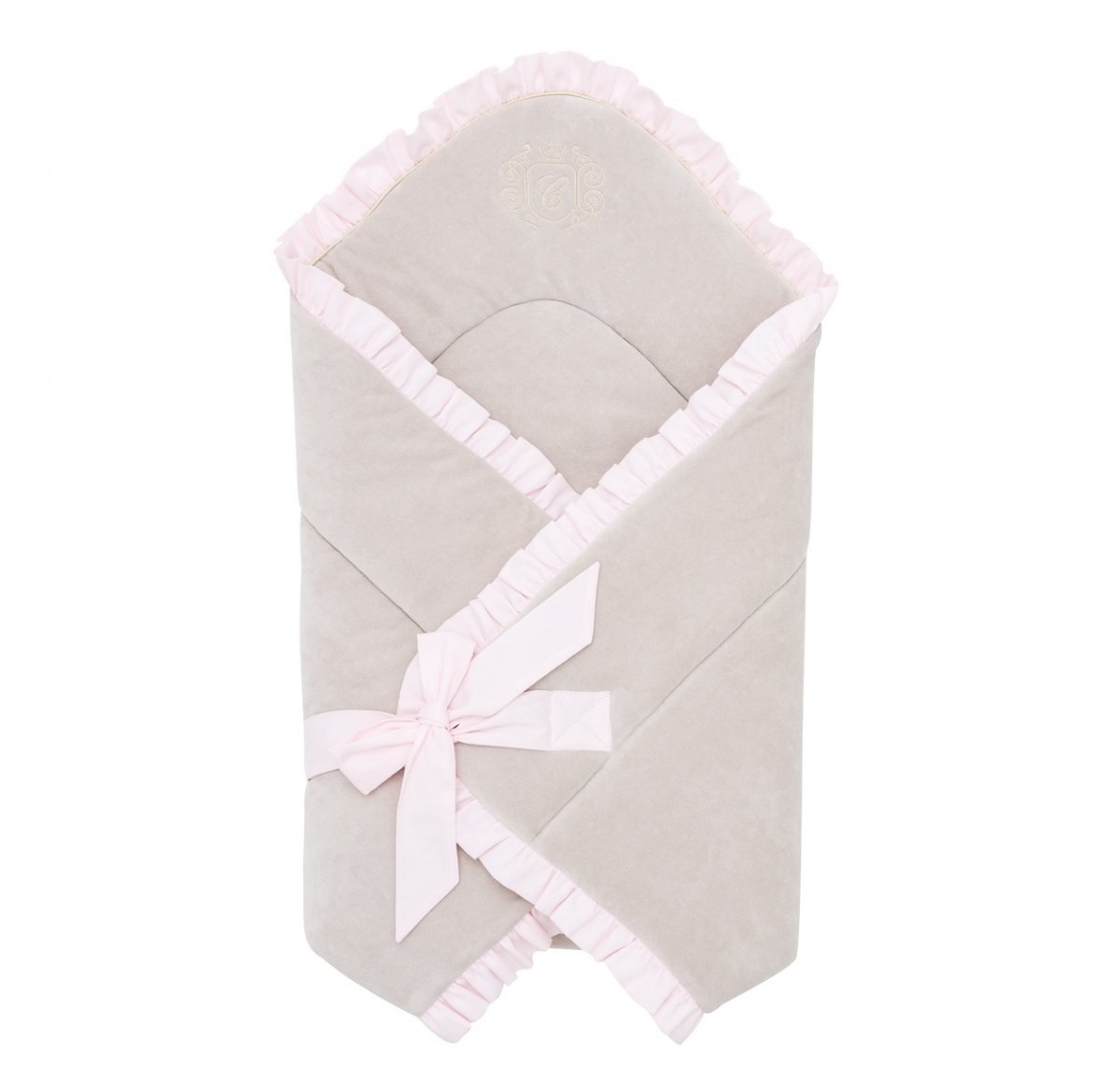 Elegant sleeping bag in beige. It is made of beige velour and filled with a fleece, making it very nice and warm. Decorated with gold company embroidery and a charming flounce. It is very comfortable to use - tied to a bow. It has no stiffening, and when unfolded it will also be perfect as a summer quilt.