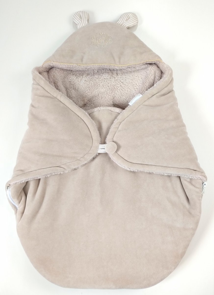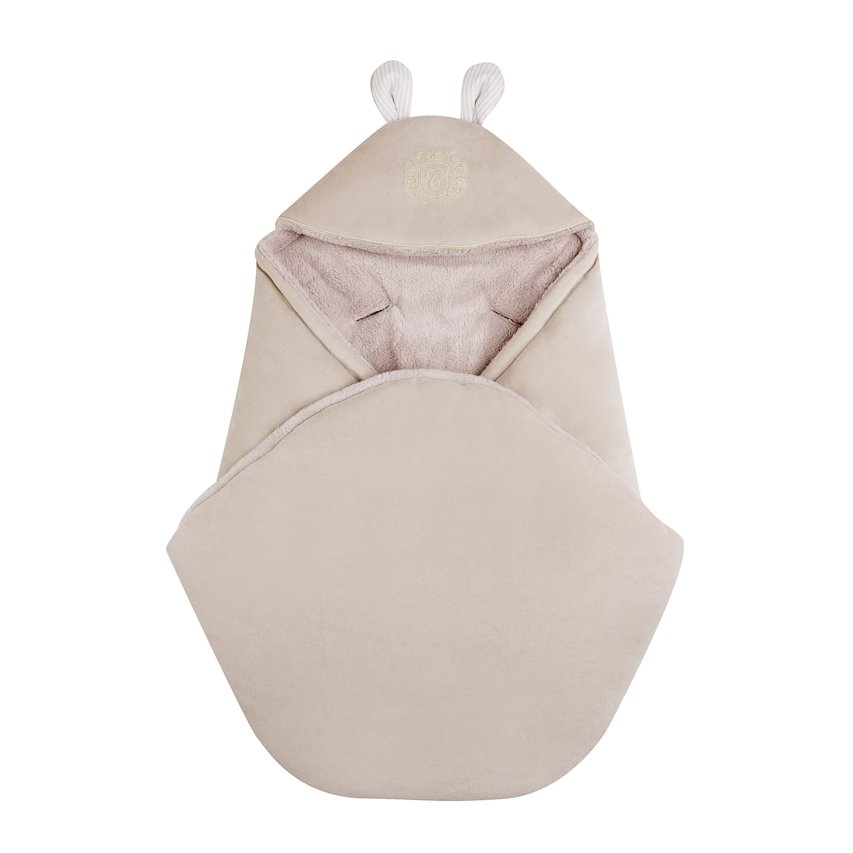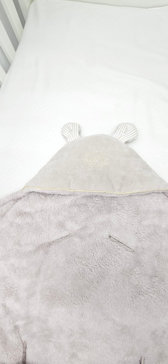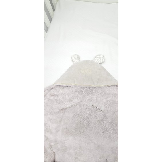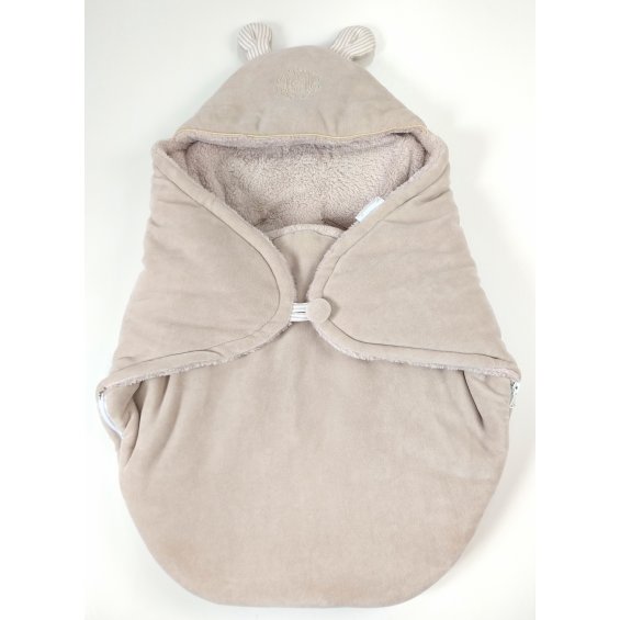 A warm velvet sleeping bag, the inside of which is made with a cosy plush fabric. The sleeping bag has a cap with an elegant golden company emblem and charming ears. There are also special holes in the back of the sleeping bag that allow you to useit in a car seat.