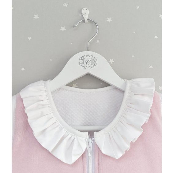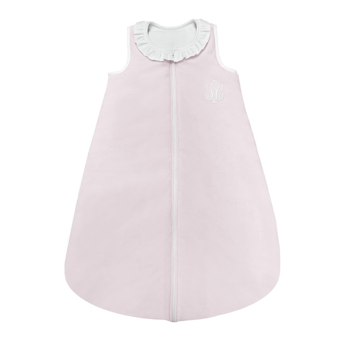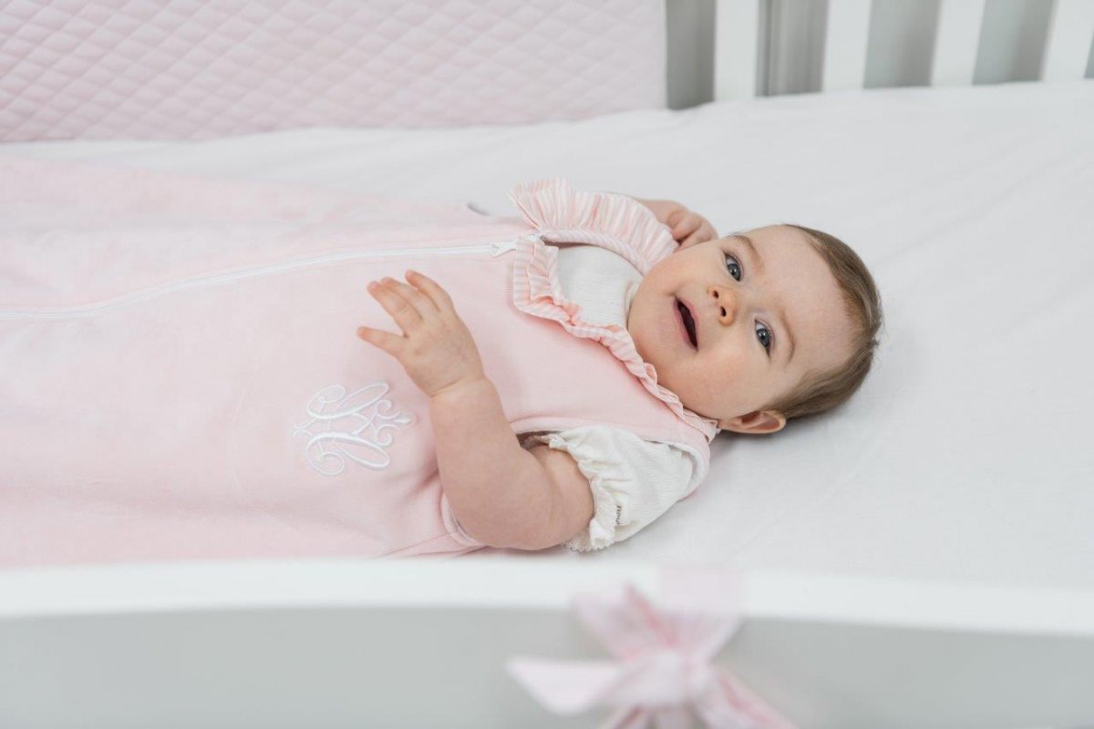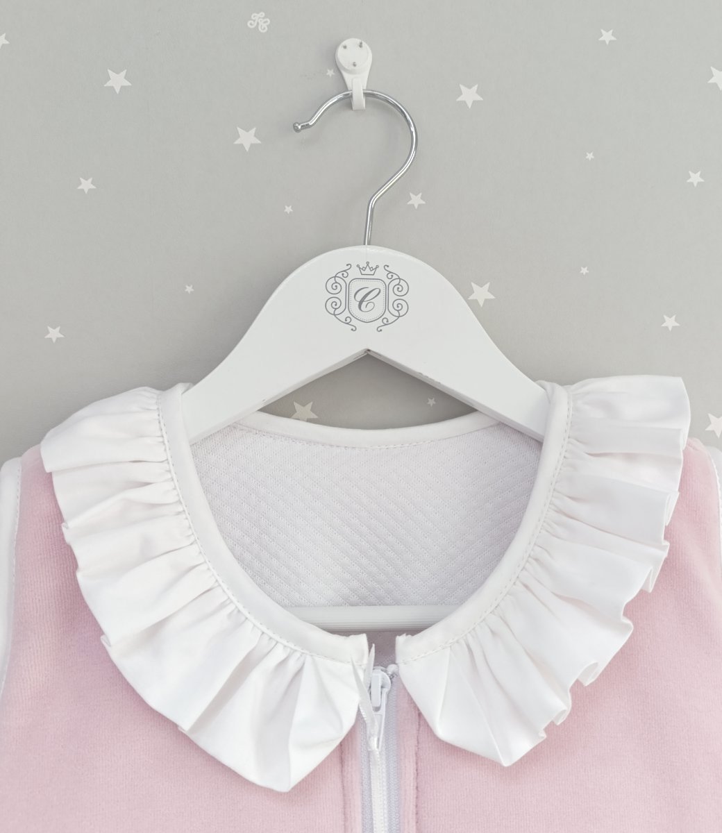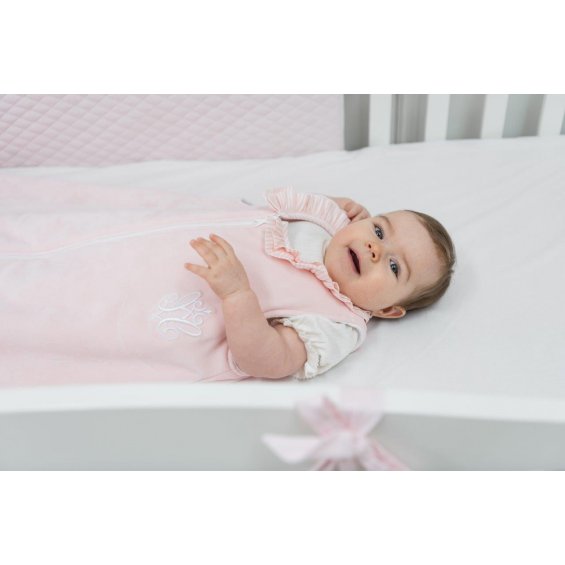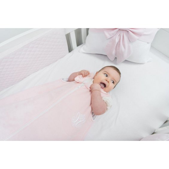 A warm sleeping bag made of soft baby pink velour. Decorated with a charming frill collar and an elegant emblem. Very convenient to use - there is a long zip on the front. Perfect for babies discovering while they sleep.