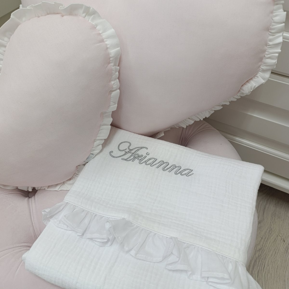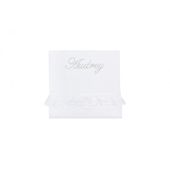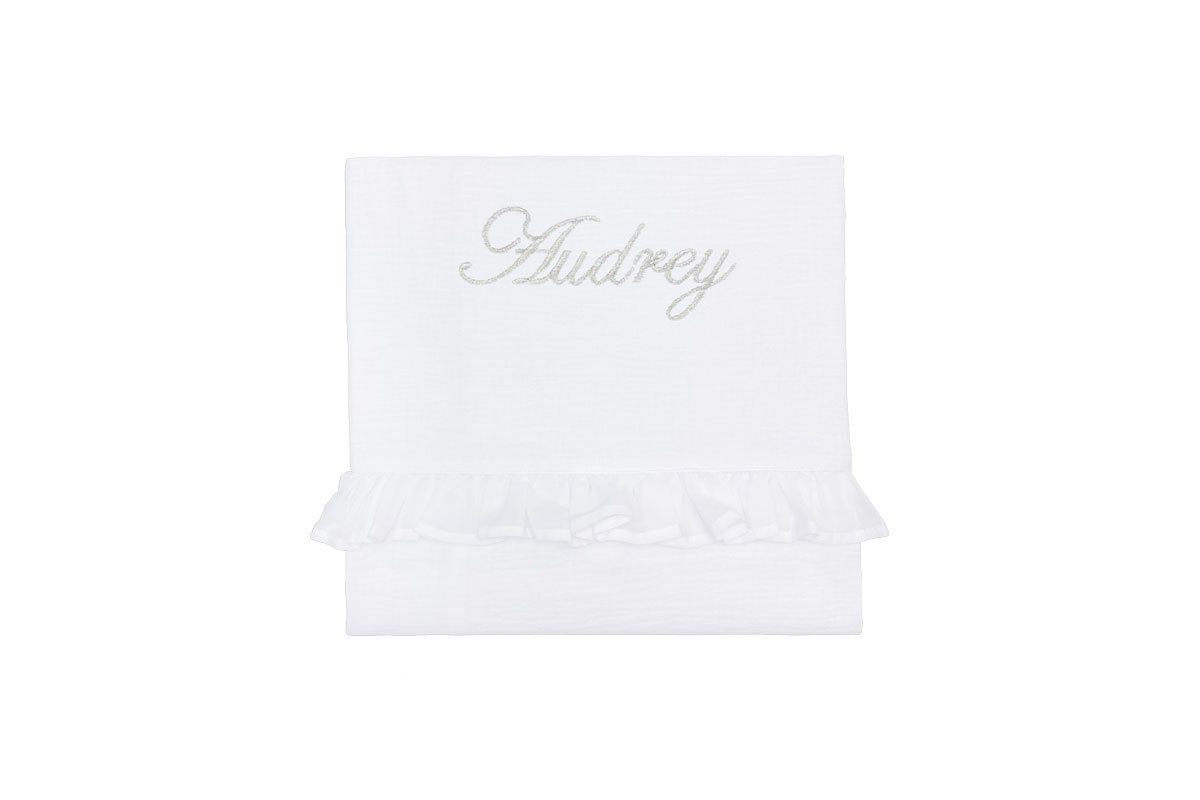 A luxurious wrap made of high-quality muslin in white. It is decorated with a transparent frill and silver embroidery with your baby's name. The wraps are perfect as a sheet, blanket, or simply to protect the baby's more delicate skin. They can also be successfully used as a stroller cover against the sun (UVA/UVB protection), wind and insects. Ideal for a christening gift - it is possible to embroider the baby's name and the date of the ceremony.