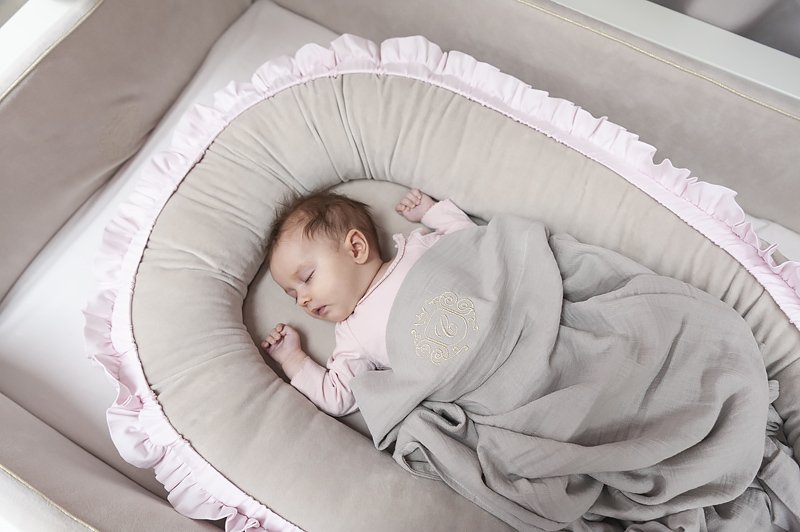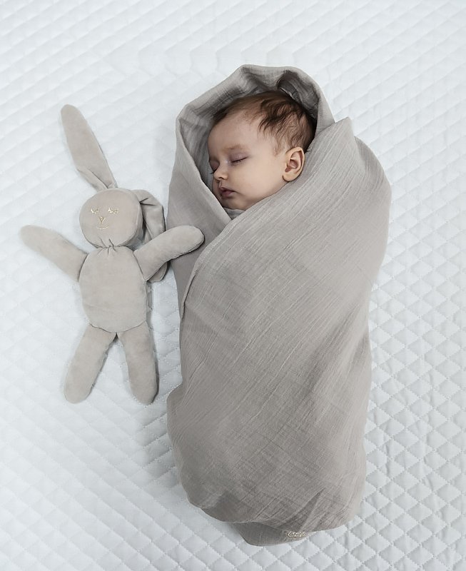 Exclusive beige swaddling blanket made of high-quality muslin textile and decorated with a gold emblem. Swaddling blanket may be used as a bedsheet, a blanket or a kind of protector of soft baby skin. You can cover a baby with them to protect your baby from sunlight (UVA/UVB radiation), wind or insects.