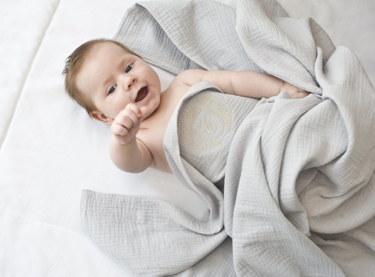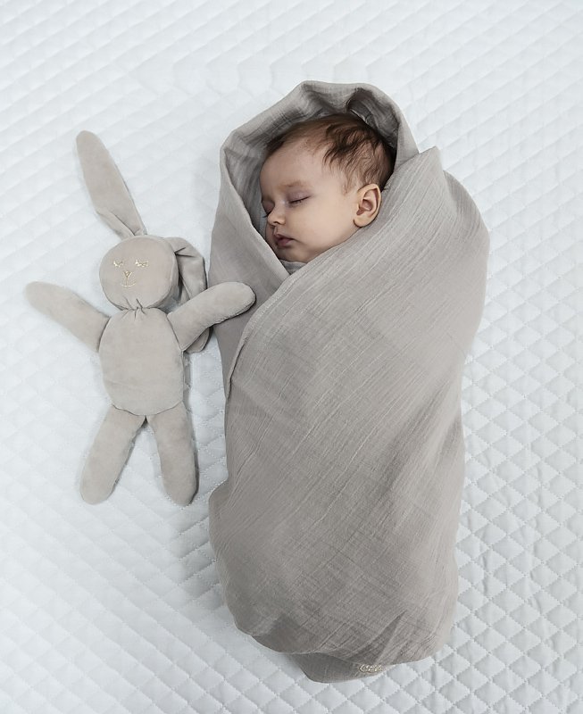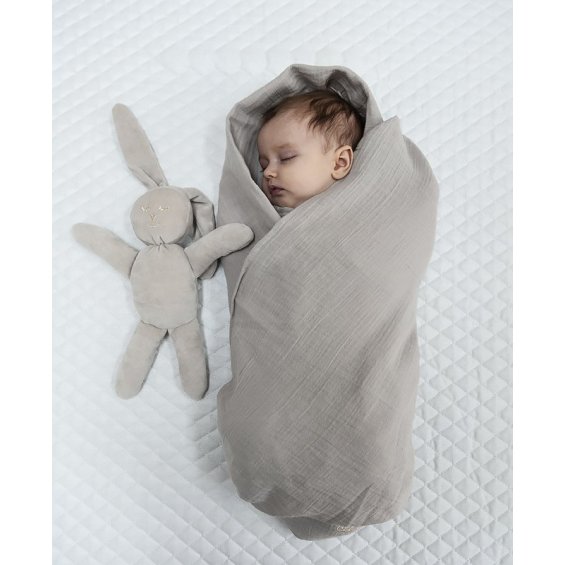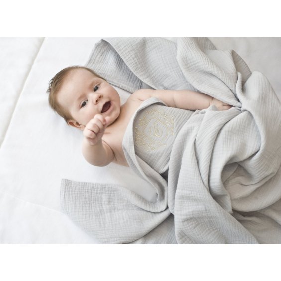 Exclusive grey swaddling blanket made of high-quality muslin textile and decorated with an emblem. Swaddling blanket may be used as a bedsheet, a blanket or a kind of protector of soft baby skin. You can cover a baby with them to protect your baby from sunlight (UVA/UVB radiation), wind or insects.