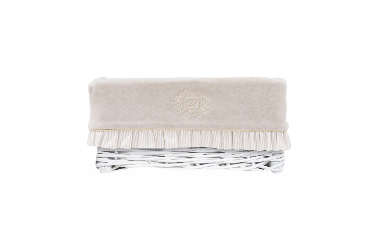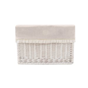 White box made of hand plaited Polish wicker lacquered in white colour. Lovely beige liner with a gold emblem and frill make it not only a useful item for storage but also a beutiful decoration. The inner part of a liner is made of solid textile resistant to any heavy toys or other items.