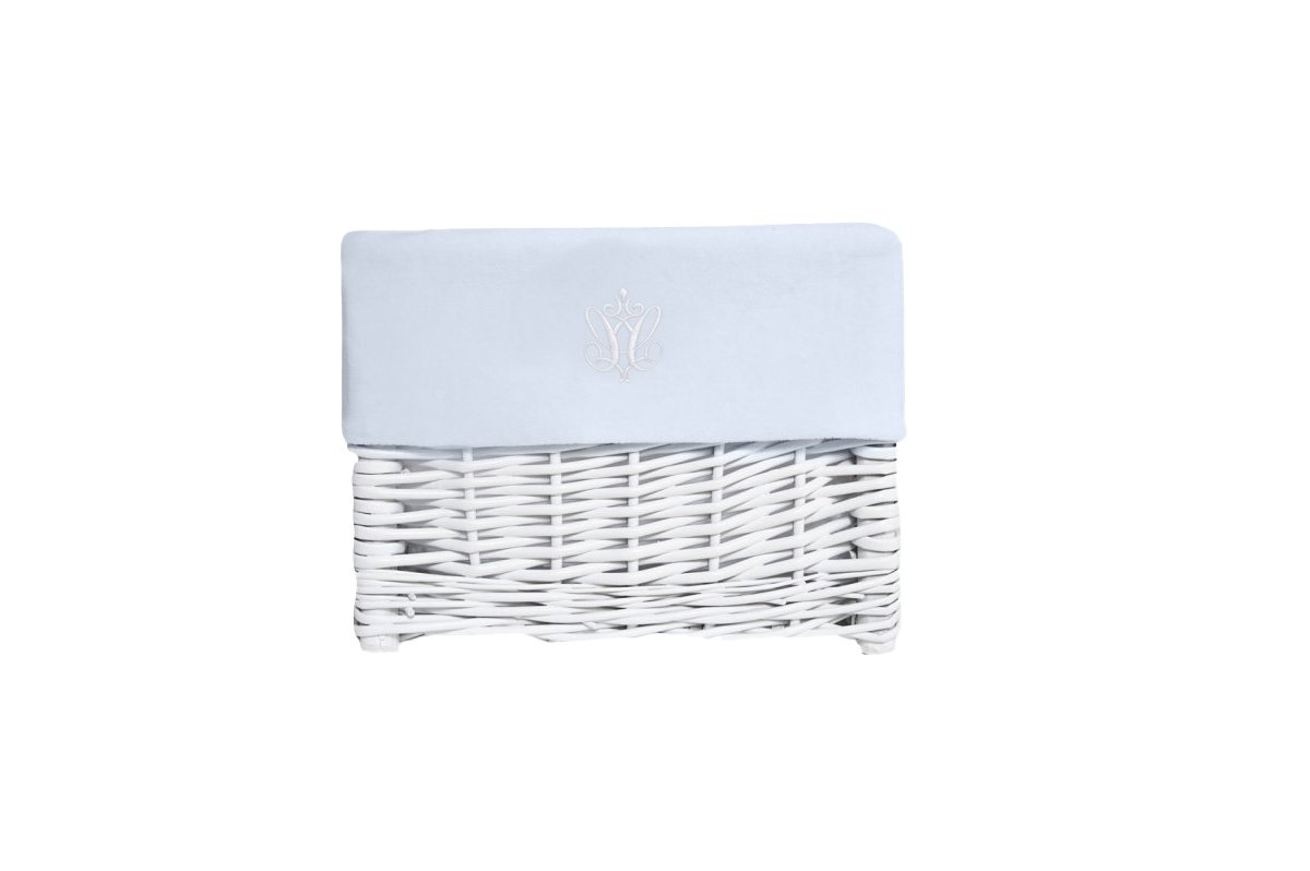 White box made of hand plaited Polish wicker lacquered in white colour. Lovely baby blue liner with three dimensional emblem make it not only a useful item for storage but also an aesthetic and boy decoration. The inner part of a liner is made of solid textile resistant to any heavy toys or other items.
