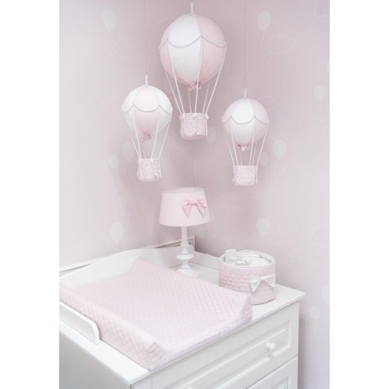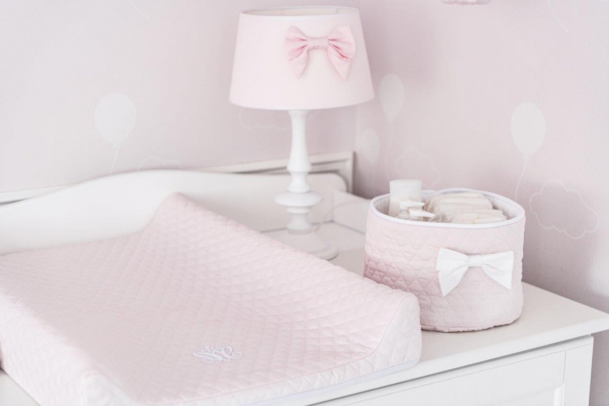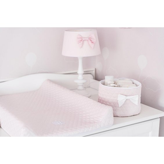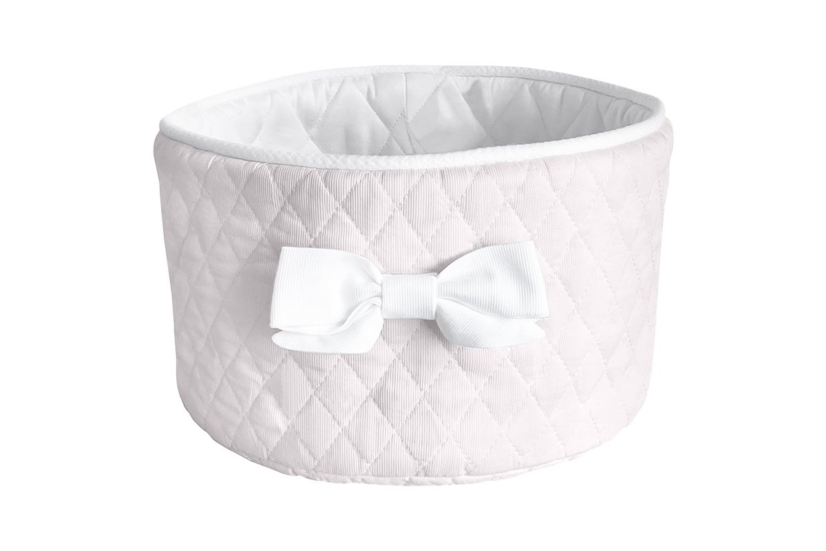 Round box made of baby pink quilted cotton and decorated with a charming bow. Perfect place for storage of toys or baby accessories.