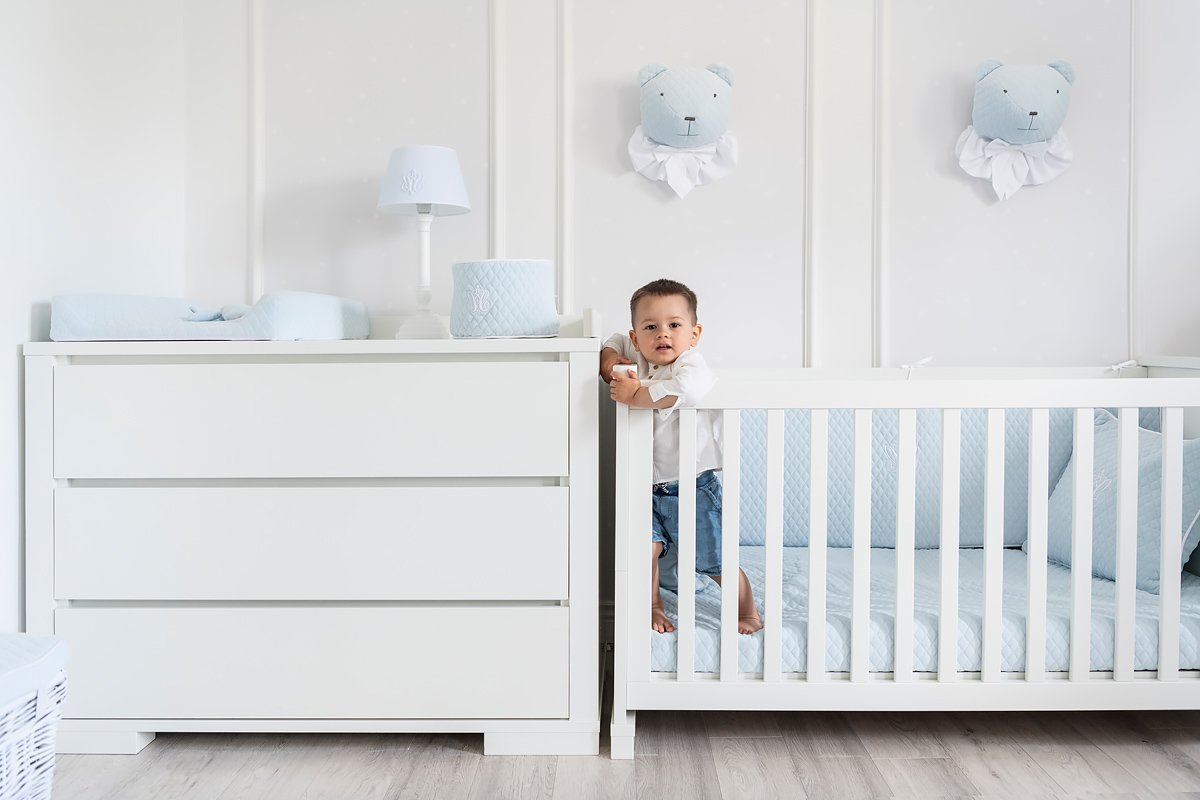 Round box made of blue quilted velour and decorated with an elegant embroidery. Perfect place for storage of toys or baby accessories.