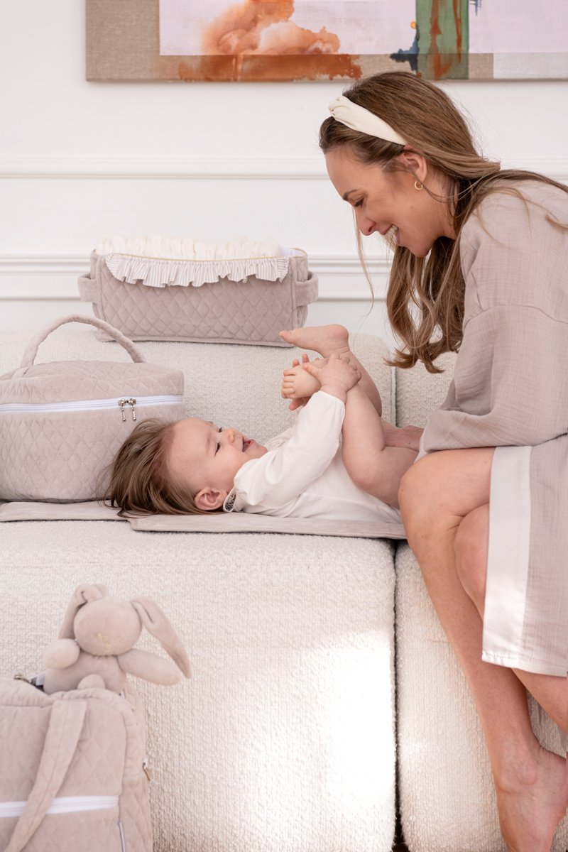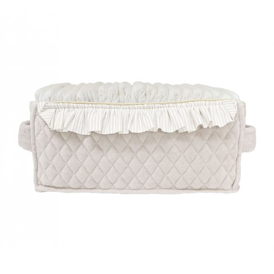 Practical box for diapers made of beige quilted velour and decorated with a frill. Its shape is adapted to the shape and size of the diapers.