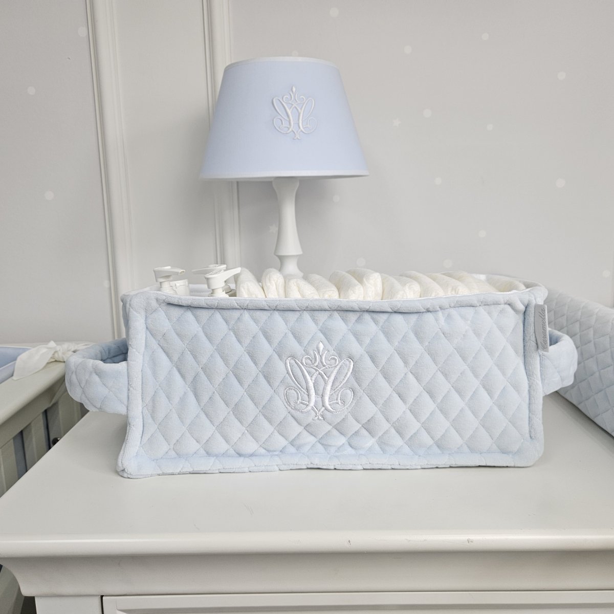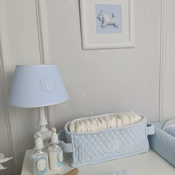 Practical box for diapers made of blue quilted velour and decorated with an elegant embroidery. Its shape is adapted to the shape and size of the diapers.