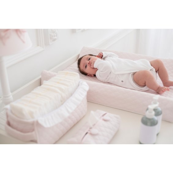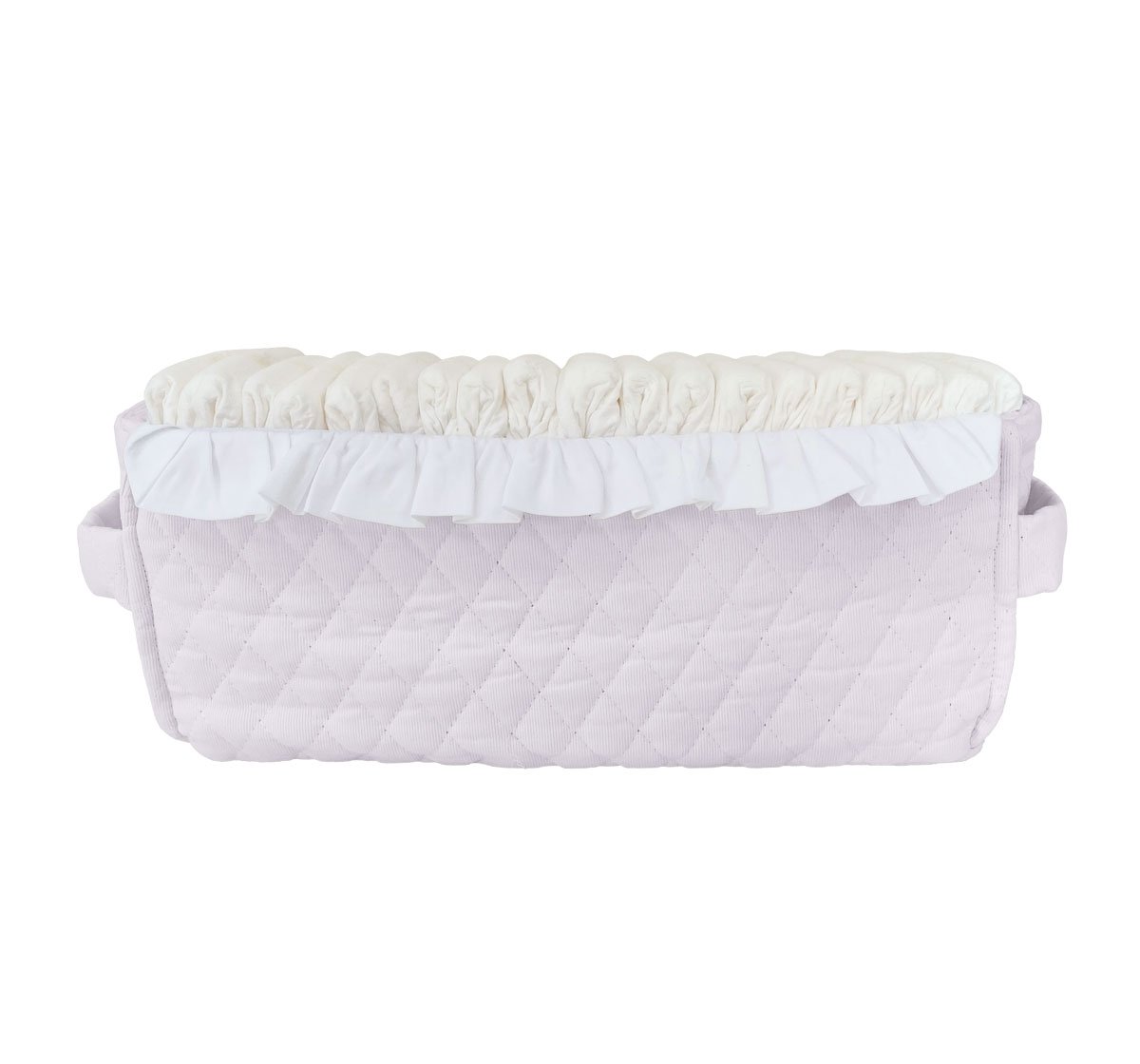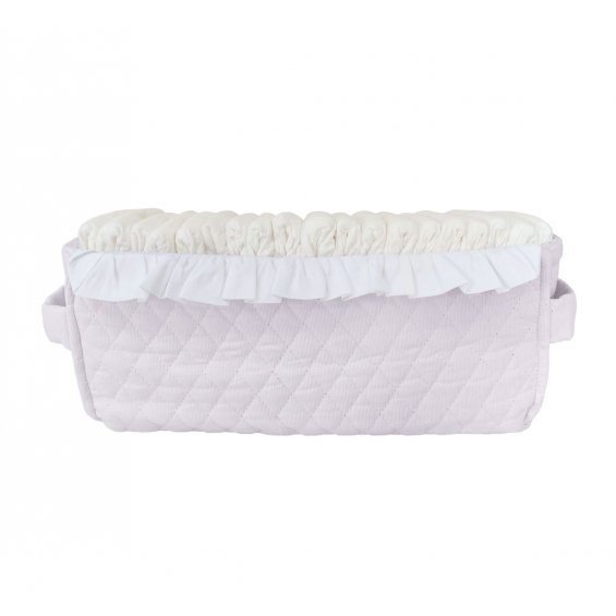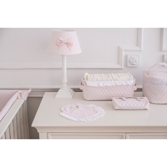 Practical box for diapers made of baby pink quilted cotton and decorated with adorable flounce. Its shape is adapted to the shape and size of the diapers.