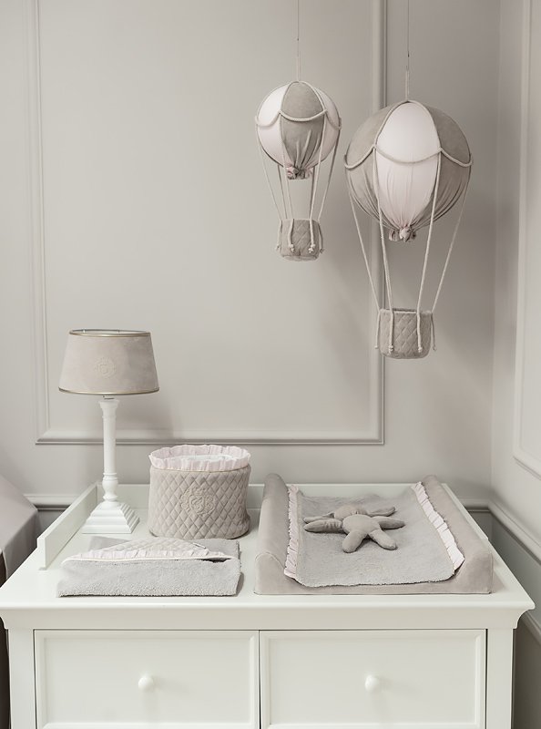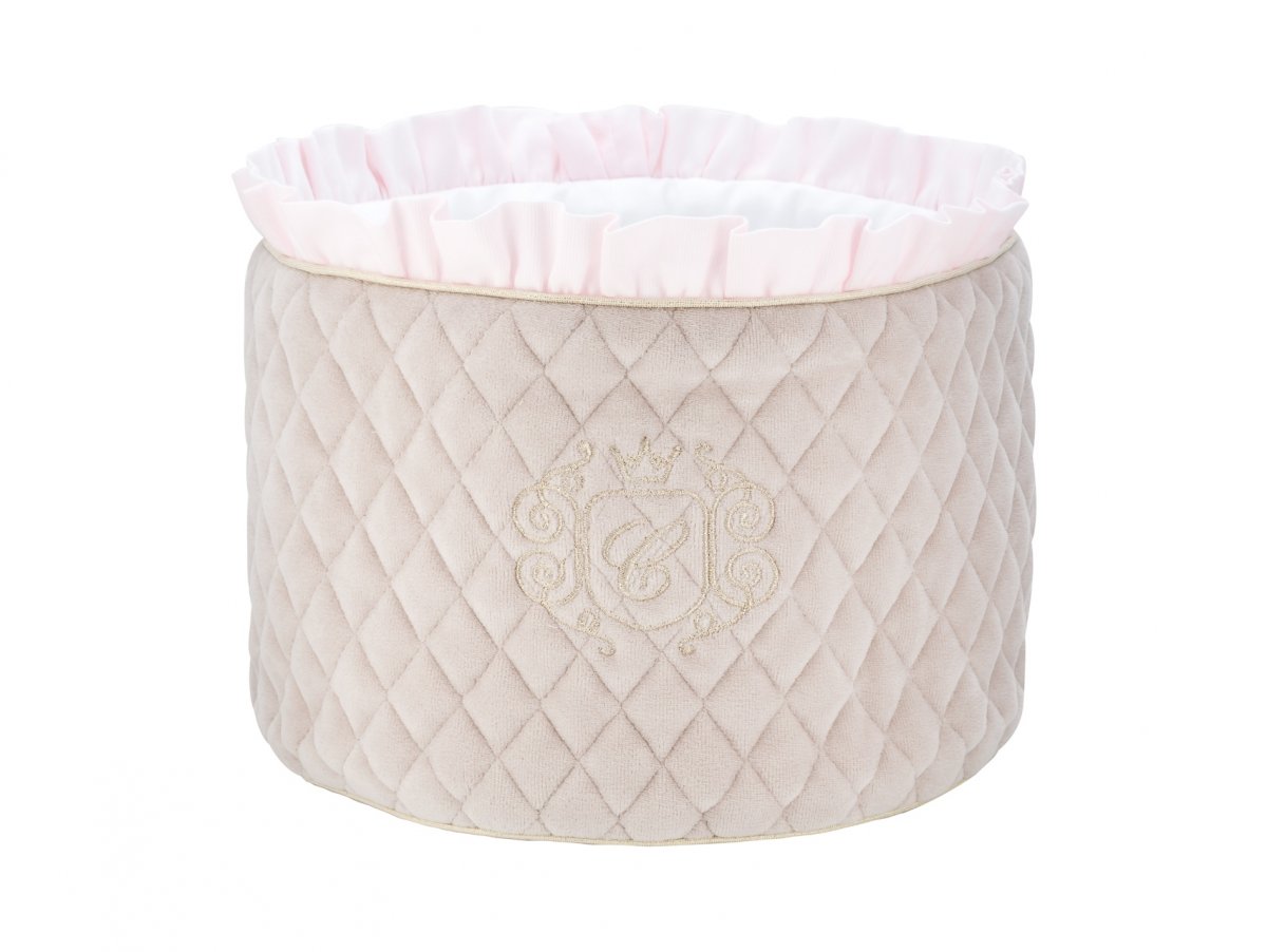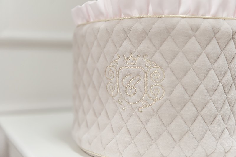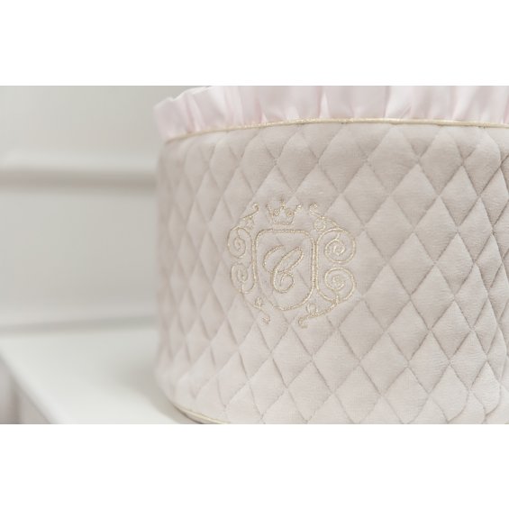 Round box made of quilted beige velour, decorated with an elegant gold embroidery and a charming pink flounce. Perfect place for storage of toys or baby accessories.