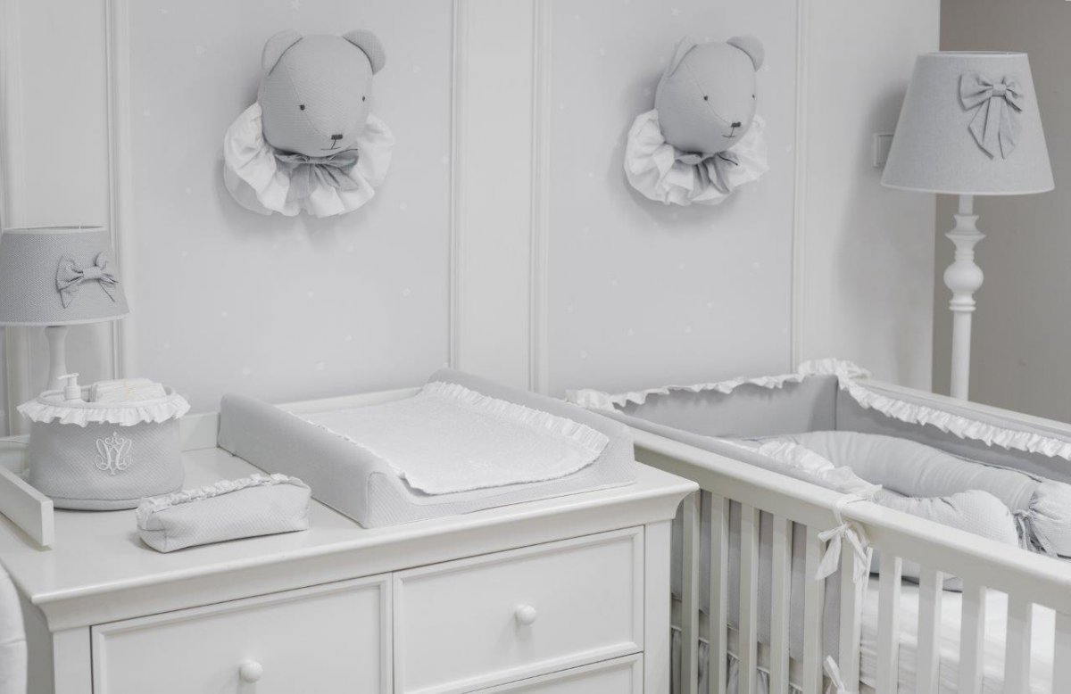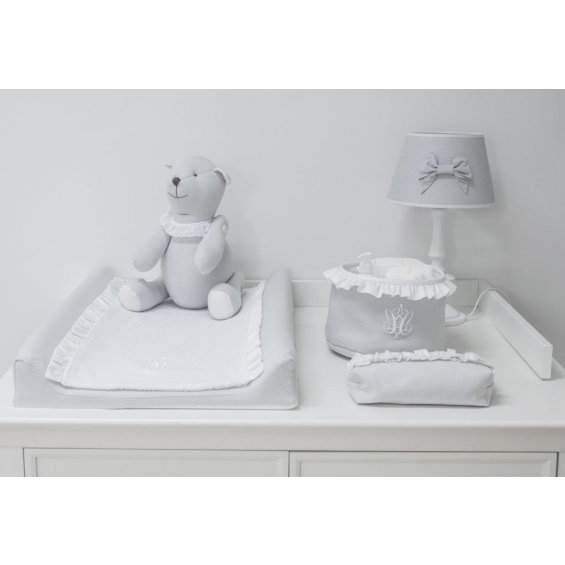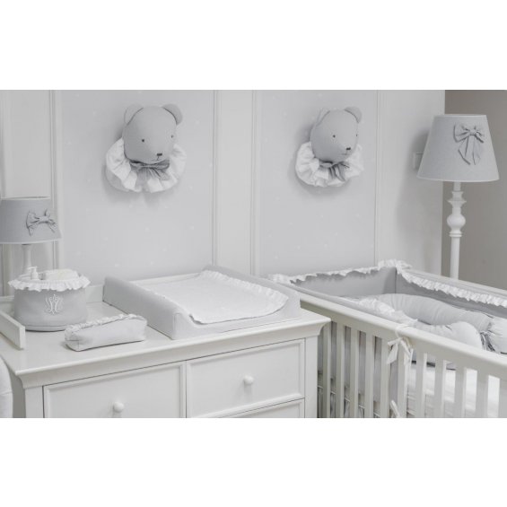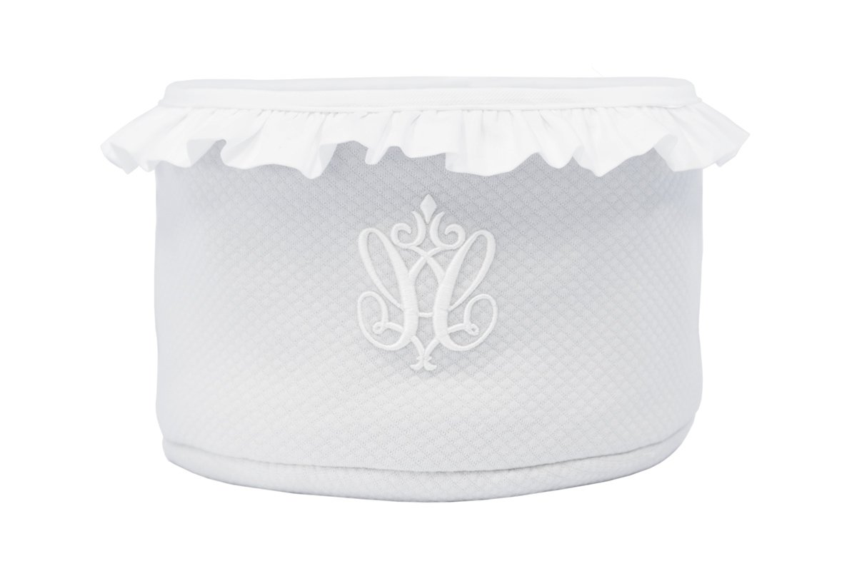 Round box made of light grey waffle fabric, decorated with an elegant embroidery and a charming flounce. It was stiffened with a sponge. Perfect place for storage of toys or baby accessories.