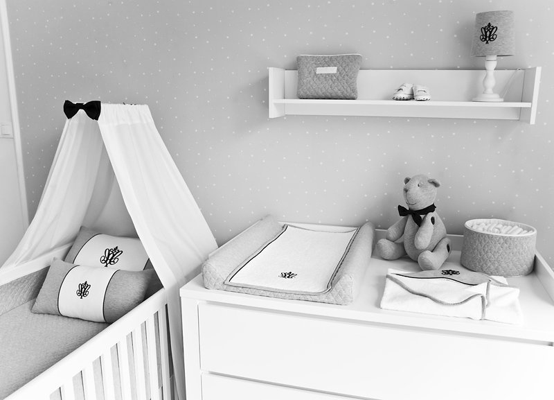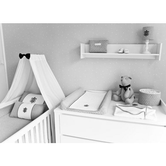 Wallpaper in a shade of light grey with white dots and stars. Its color fits perfectly with the collections: Pure Gray and Manhattan, it will also be a beautiful background for pink and blue accessories. It is possible to buy stucco moldings to create unique wall decoration.