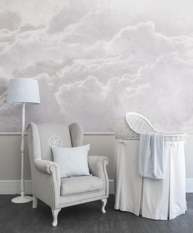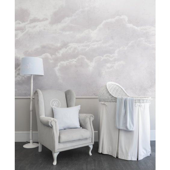 Wall mural dream pink with a motif of clouds in shades of gray. The size of the wallpaper is individually adapted to the size of the wall. It is possible to purchase stucco moldings to create unique wall decorations.