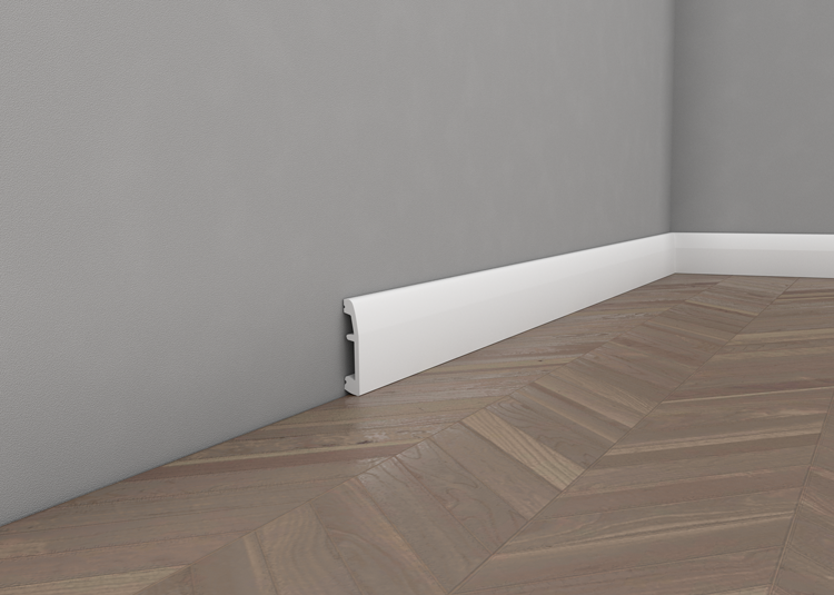 An elegant floor moulding. It is made of hard, inflexible fabric resistan to damages. The moulding is covered with primer ready to apply other paints eg. acrylic. It is light, resistant to water and moisture, may be cleaned, non-inflammable and non-toxic. Mouldings are easy to install and may be panels or tiles finishing element. It can also hide all electric wires.