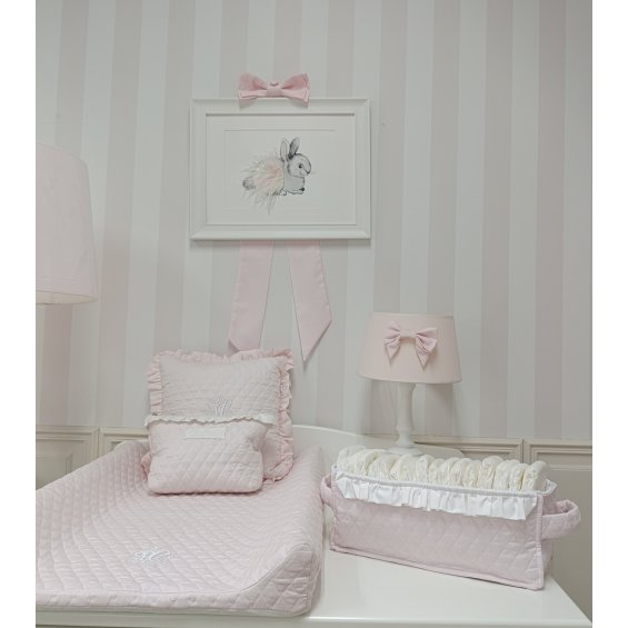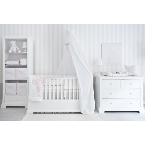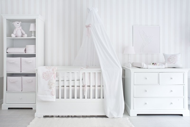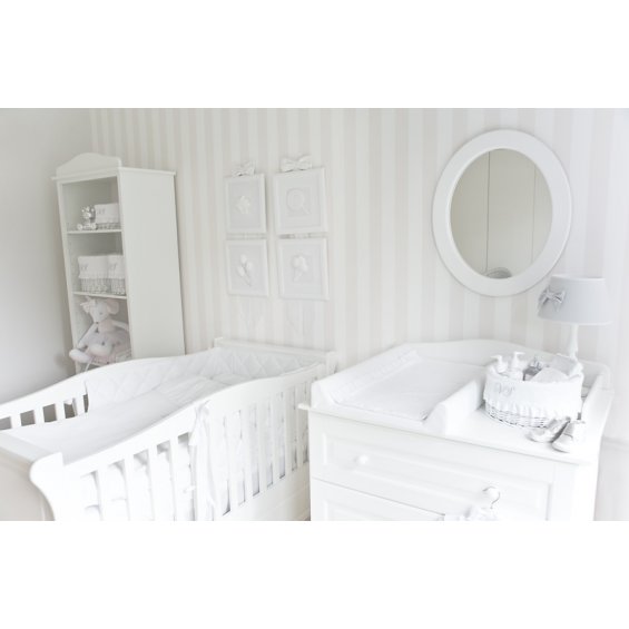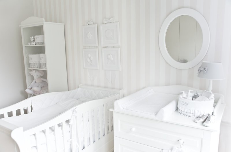 White wallpaper with stripes in a shade of cold light powder pink 7 cm wide. It will be the perfect background for accessories from collections: Baby Pink, Golden Chic, Pure Grey and Pastel Chic. It is possible to buy stucco moldings to create unique wall decoration.