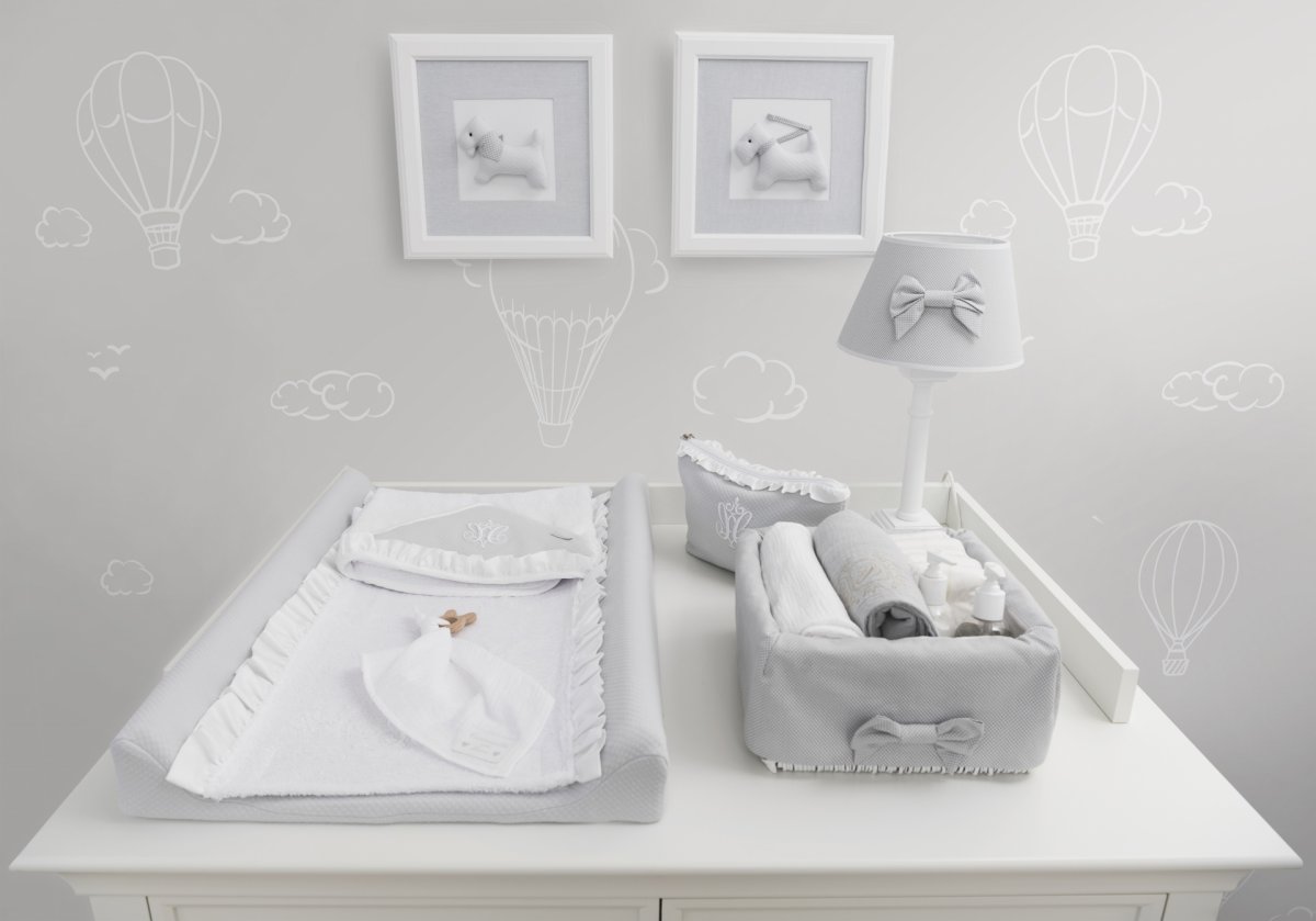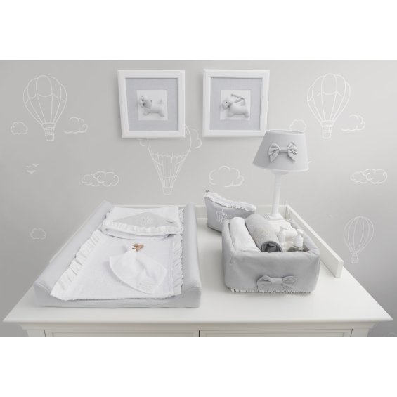 Wallpaper in a shade of light grey with hot air baloons and clouds (height of balloons: 16 cm, 20 cm, 24 cm). Its color fits perfectly with the collections: Pure Gray and Manhattan, it will also be a beautiful background for pink and blue accessories. It is possible to buy stucco moldings to create unique wall decoration.