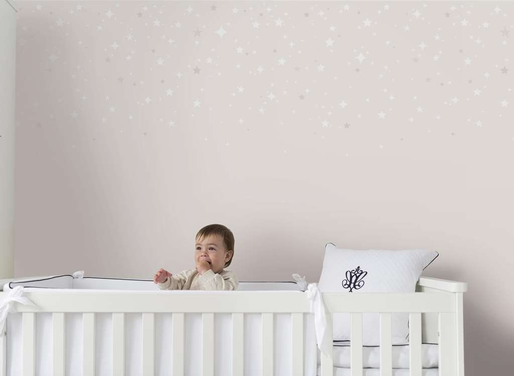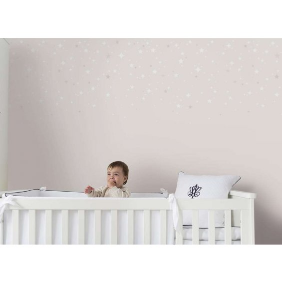 Wallpaper in a shade of cold light beige with falling stars. Its color perfectly matches the fabrics used in the collections: Golden Sand, Pastel Chic and Modern Classic. The wallpaper will also be a beautiful background for pink and blue accessories. It is possible to buy stucco moldings to create unique wall decoration.